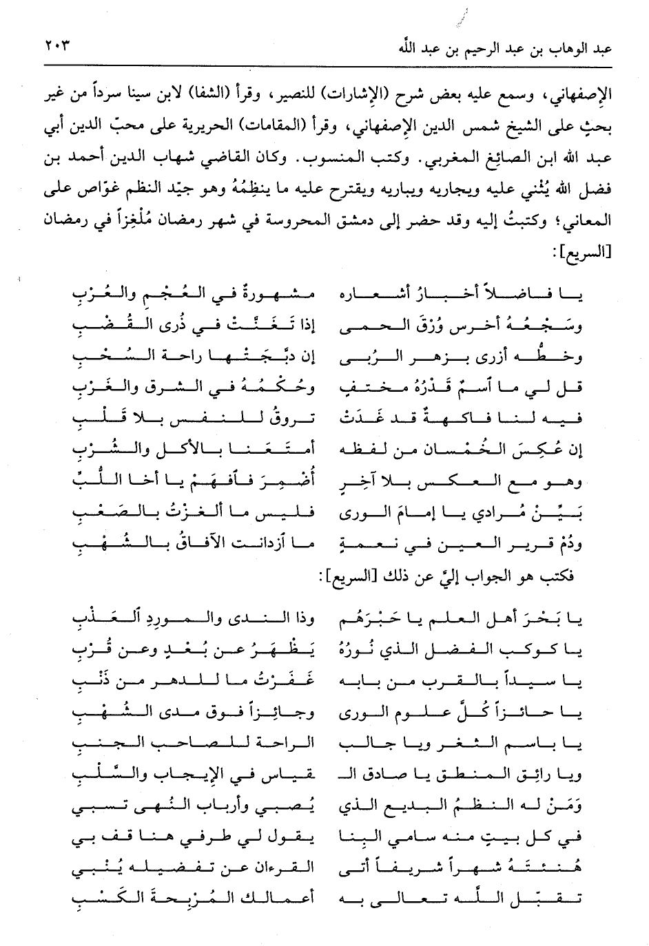 (يَا فَاضلا أَخْبَار أشعاره ... مَشْهُورَة فِي الْعَجم وَالْعرب)