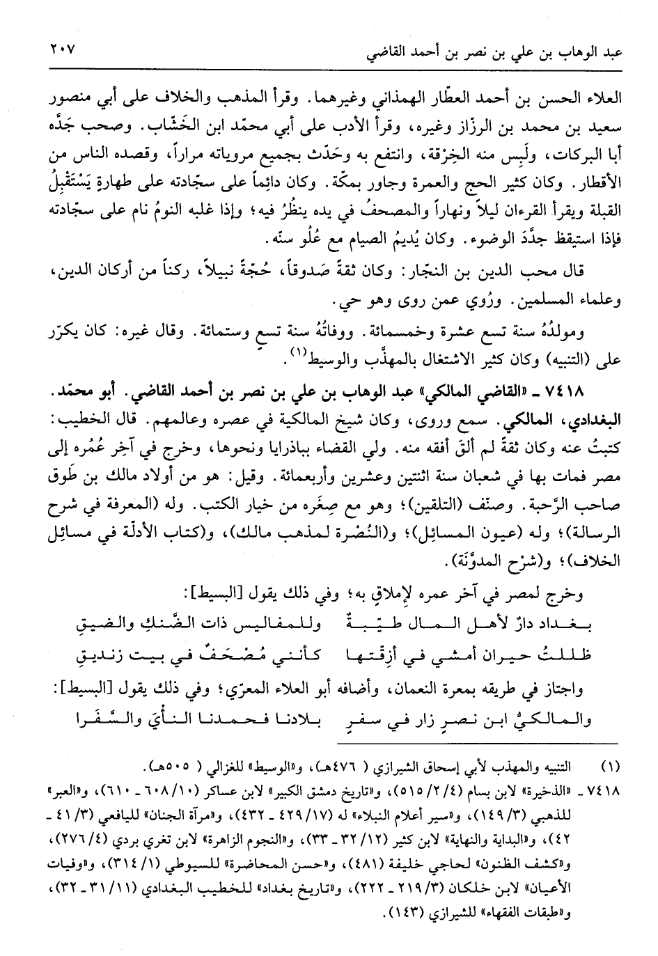 عبد الْوَهَّاب بن عَليّ بن نصر بن أَحْمد القَاضِي أَبُو مُحَمَّد الْبَغْدَادِيّ الْمَالِكِي سمع وروى
