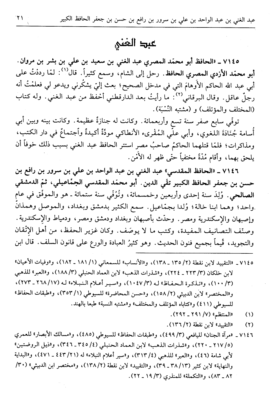 عبد الْغَنِيّ بن سعيد بن عَليّ بن بشر بن مَرْوَان أَبُو مُحَمَّد الْأَزْدِيّ الْمصْرِيّ الْحَافِظ رَحل إِلَى الشَّام وَسمع كثيرا قَالَ لما رددت على أبي عبد الله الْحَاكِم الأوهام الَّتِي فِي مدْخل الصَّحِيح بعث إِلَيّ يشكرني وَيَدْعُو لي فَعلمت أَنه رجل عَاقل وَقَالَ البرقاني مَا رَأَيْت بعد الدَّارَقُطْنِيّ أحفظ من عبد الْغَنِيّ وَله كتاب الْمُخْتَلف والمؤتلف ومشتبه النِّسْبَة