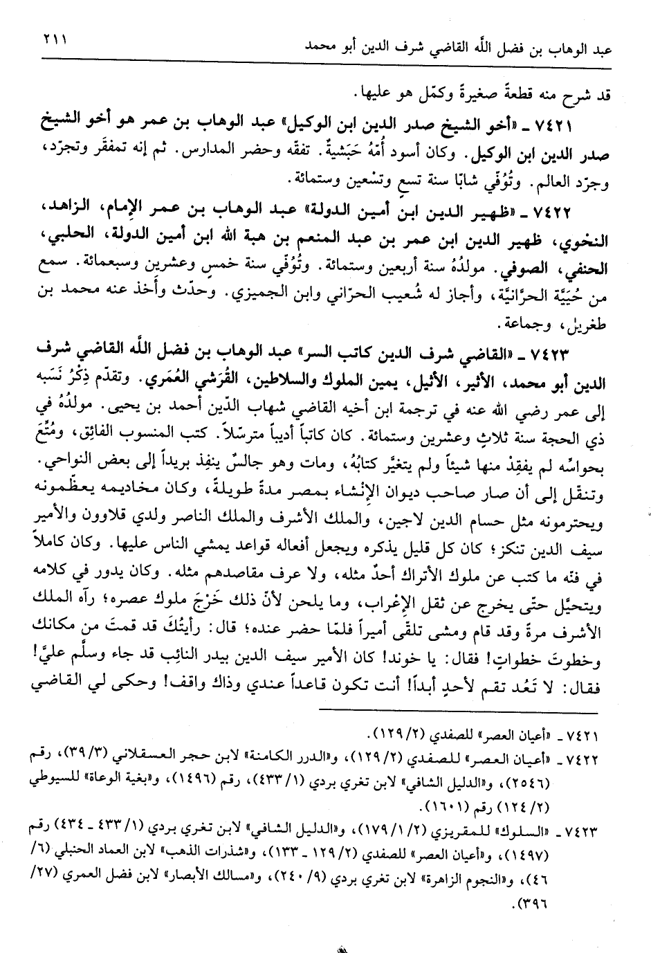 عبد الْوَهَّاب بن فضل الله القَاضِي شرف الدّين أَبُو مُحَمَّد الْأَثِير الأثيل يَمِين الْمُلُوك والسلاطين الْقرشِي الْعمريّ وَتقدم ذكر نسبه إِلَى عمر رَضِي الله عَنهُ فِي تَرْجَمَة ابْن أَخِيه القَاضِي شهَاب الدّين أَحْمد بن يحيى مولده فِي ذِي الْحجَّة سنة ثَلَاث وَعشْرين وست ماية