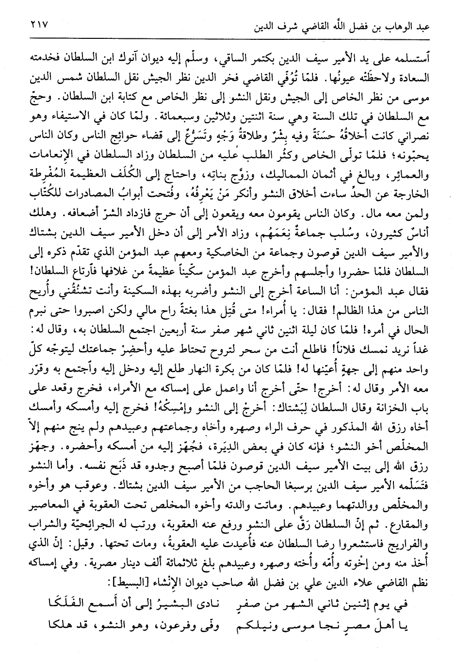 استسلمه على يَد الْأَمِير سيف الدّين بكتمر الساقي وَسلم إِلَيْهِ ديوَان آنوك ابْن السُّلْطَان فخدمته السَّعَادَة ولاحظته عيونها فَلَمَّا توفّي القَاضِي فَخر الدّين نَاظر الْجَيْش نقل السُّلْطَان شمس الدّين مُوسَى من نظر الْخَاص إِلَى الْجَيْش وَنقل النشو إِلَى نظر الْخَاص مَعَ كِتَابَة ابْن السُّلْطَان وَحج مَعَ السُّلْطَان فِي تِلْكَ السّنة وَهِي سنة اثْنَتَيْنِ وَثَلَاثِينَ وَسبع ماية وَلما كَانَ فِي الِاسْتِيفَاء وَهُوَ نَصْرَانِيّ كَانَت أخلاقه حَسَنَة وَفِيه بشر وطلاقة وَجه وتسرع إِلَى قَضَاء حوائج النَّاس وَكَانَ النَّاس يحبونه فَلَمَّا تولى الْخَاص وَكثر الطّلب عَلَيْهِ من السُّلْطَان وَزَاد السُّلْطَان فِي الإنعامات والعمائر وَبَالغ فِي أَثمَان المماليك وَزوج بَنَاته وَاحْتَاجَ إِلَى الكلف الْعَظِيمَة المفرطة الْخَارِجَة عَن الْحَد ساءت أَخْلَاق النشو وَأنكر من يعرفهُ وَفتحت أَبْوَاب المصادرات للْكتاب وَلمن مَعَه مَال وَكَانَ النَّاس يقومُونَ مَعَه ويقعون إِلَى أَن حرج فازداد الشَّرّ أضعافه وَهلك أنَاس كَثِيرُونَ وسلب جمَاعَة نعمهم وَزَاد الْأَمر إِلَى أَن دخل الْأَمِير سيف الدّين بشتاك والأمير سيف الدّين قوصون وَجَمَاعَة من الخاصكية وَمَعَهُمْ عبد الْمُؤمن الَّذِي تقدم ذكره إِلَى السُّلْطَان فَلَمَّا حَضَرُوا وأجلسهم وَأخرج عبد الْمُؤمن سكيناً عَظِيمَة من غلافها فارتاع السُّلْطَان فَقَالَ عبد الْمُؤمن أَنا السَّاعَة)