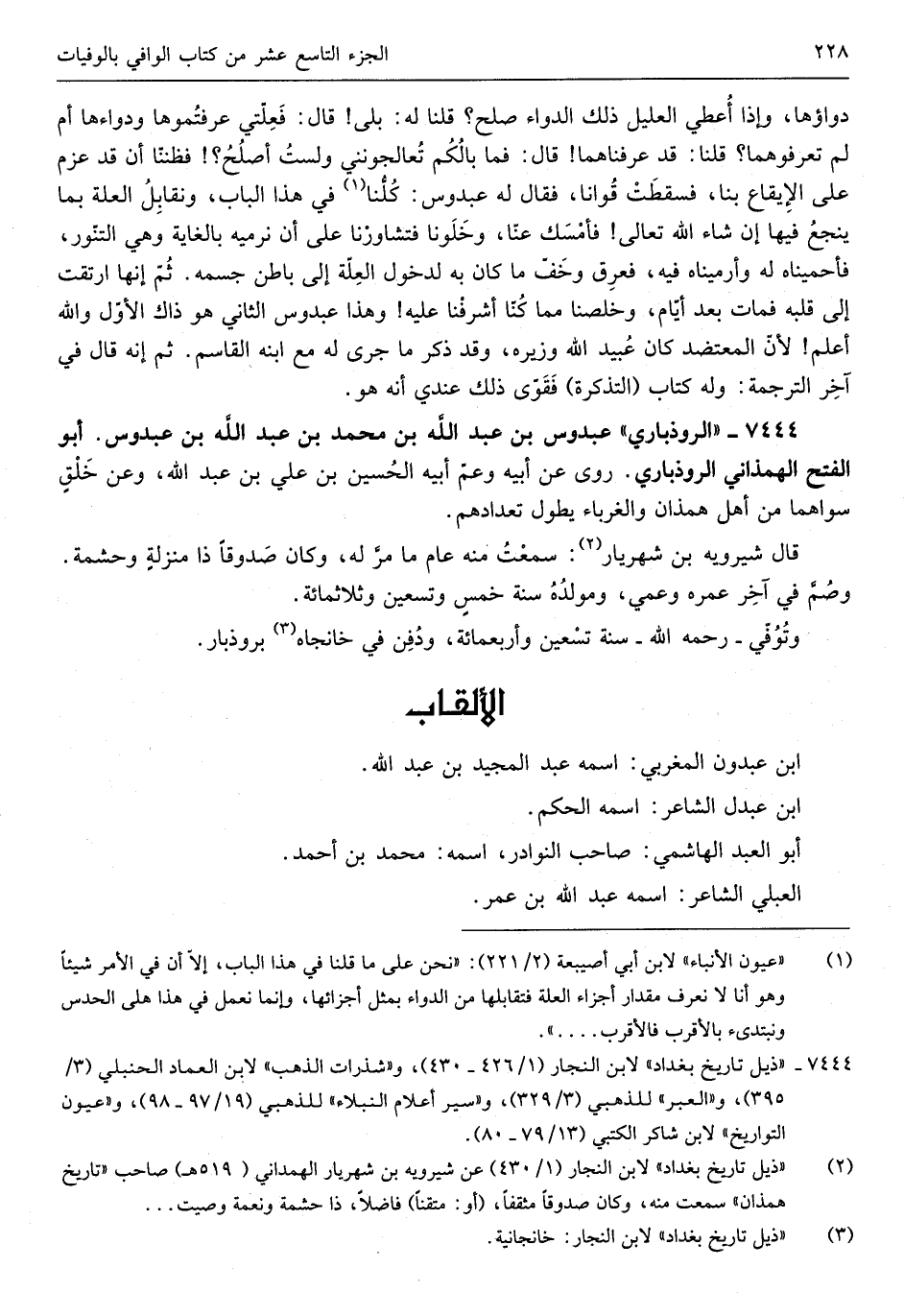 دواؤها وَإِذا أعطي العليل ذَلِك الدَّوَاء صلح قُلْنَا لَهُ بلَى قَالَ فعلتي عرفتموها ودواءها أم لم تعرفوهما قُلْنَا قد عرفناهما قَالَ فَمَا بالكم تعالجونني وَلست أصلح فطننا أَن قد عزم على الْإِيقَاع بِنَا فَسَقَطت قوانا فَقَالَ لَهُ عَبدُوس كلنا فِي هَذَا الْبَاب ونقابل الْعلَّة بِمَا ينجع فِيهَا إِن شَاءَ الله تَعَالَى فَأمْسك عَنَّا وخلونا فتشاورنا على أَن نرميه بالغاية وَهِي التَّنور فأحميناه لَهُ وأرميناه فِيهِ فعرق وخف مَا كَانَ بِهِ لدُخُول الْعلَّة إِلَى بَاطِن جِسْمه ثمَّ إِنَّهَا ارتقت إِلَى قلبه فَمَاتَ بعد أَيَّام وخلصنا مِمَّا كُنَّا أَشْرَفنَا عَلَيْهِ وَهَذَا عَبدُوس الثَّانِي هُوَ ذَاك الأول وَالله أعلم لِأَن المعتضد كَانَ عبيد الله وزيره وَقد ذكر مَا جرى لَهُ مَعَ ابْنه الْقَاسِم ثمَّ إِنَّه قَالَ فِي آخر التَّرْجَمَة وَله كتاب التَّذْكِرَة فقوى ذَلِك عِنْدِي أَنه هُوَ
