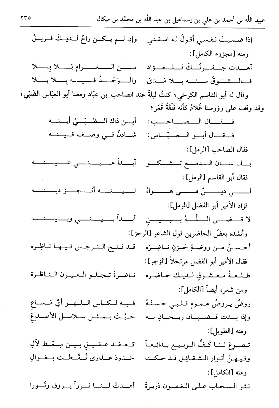 وَقَالَ بِهِ أَبُو الْقَاسِم الْكَرْخِي كنت لَيْلَة عِنْد الصاحب بن عباد ومعنا أَبُو الْعَبَّاس الصَّبِي وَقد وقف على رؤوسنا غُلَام كَأَنَّهُ فلقَة قمر فَقَالَ الصاحب أَيْن ذَاك الظبي أينه)