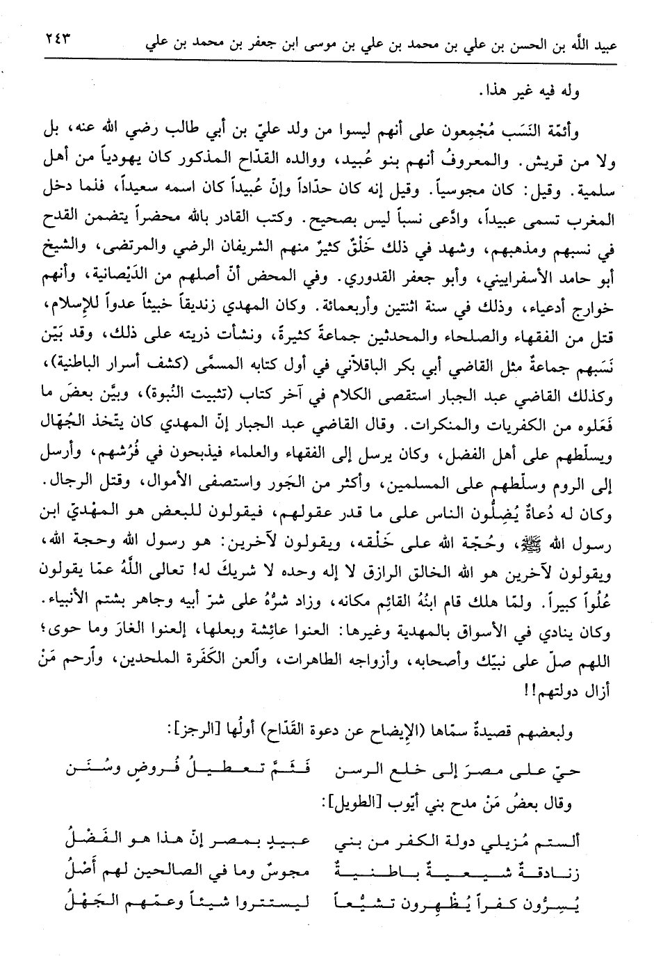 وأئمة النّسَب مجمعون على أَنهم لَيْسُوا من ولد عَليّ بن أبي طَالب رَضِي الله عَنهُ بل وَلَا من قُرَيْش وَالْمَعْرُوف أَنهم بَنو عبيد ووالده القداح الْمَذْكُور كَانَ يَهُودِيّا من أهل سلمية وَقيل كَانَ مجوسياً وَقيل إِنَّه كَانَ حداداً وَإِن عبيدا كَانَ اسْمه سعيداً فَلَمَّا دخل الْمغرب تسمى عبيدا وَادّعى نسبا لَيْسَ بِصَحِيح وَكتب الْقَادِر بِاللَّه محضراً يتَضَمَّن الْقدح فِي نسبهم ومذهبهم وَشهد فِي ذَلِك خلق كثير مِنْهُم الشريفان الرضي والمرتضى وَالشَّيْخ أَبُو حَامِد الأسفراييني وَأَبُو جَعْفَر الْقَدُورِيّ وَفِي الْمحْضر أَن أصلهم من الديصانية وَأَنَّهُمْ خوارج أدعياء وَذَلِكَ فِي سنة اثْنَتَيْنِ وَأَرْبع ماية وَكَانَ الْمهْدي زنديقاً خبيثاً عدوا لِلْإِسْلَامِ قتل من الْفُقَهَاء والصلحاء والمحدثين جمَاعَة كَثِيرَة ونشأت ذُريَّته على ذَلِك وَقد بَين نسبهم جمَاعَة مثل القَاضِي أبي بكر الباقلاني فِي أول كِتَابه الْمُسَمّى كشف أسرار الباطنية وَكَذَلِكَ القَاضِي عبد الْجَبَّار استقصى الْكَلَام فِي آخر كتاب تثبيت النُّبُوَّة وَبَين بعض مَا فَعَلُوهُ من الكفريات والمنكرات وَقَالَ القَاضِي عبد الْجَبَّار إِن الْمهْدي كَانَ يتَّخذ الْجُهَّال ويسلطهم على أهل الْفضل وَكَانَ يُرْسل إِلَى الْفُقَهَاء وَالْعُلَمَاء فَيذبحُونَ فِي فرشهم وَأرْسل إِلَى الرّوم وسلطهم على الْمُسلمين وَأكْثر من الْجور واستصفى الْأَمْوَال وَقتل الرِّجَال وَكَانَ لَهُ دعاة يضلون النَّاس على قدر عُقُولهمْ فَيَقُولُونَ للْبَعْض هُوَ الْمهْدي ابْن رَسُول الله صلى الله عَلَيْهِ وَسلم وَحجَّة الله على خلقه وَيَقُولُونَ لآخرين هُوَ رَسُول الله وَحجَّة الله وَيَقُولُونَ لآخرين هُوَ الله الْخَالِق الرازق لَا إِلَه وَحده لَا شريك لَهُ تَعَالَى الله عَمَّا يَقُولُونَ علوا كَبِيرا وَلما هلك قَامَ ابْنه الْقَائِم مَكَانَهُ وَزَاد فِي شَره على شَرّ أَبِيه وجاهر بشتم الْأَنْبِيَاء وَكَانَ يُنَادي فِي الْأَسْوَاق بالمهدية وَغَيرهَا العنوا)