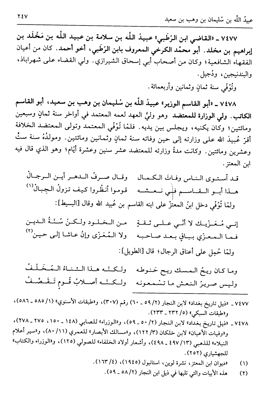 عبيد الله بن سُلَيْمَان بن وهب بن سعيد أَبُو الْقَاسِم الْكَاتِب ولي الوزارة للمعتضد وَهُوَ لي الْعَهْد لِعَمِّهِ الْمُعْتَمد فِي أَوَاخِر سنة ثَمَان وَسبعين ومايتين وَكَانَ يَكْتُبهُ وَيجْلس بَين يَدَيْهِ وفلما توفّي الْمُعْتَمد وَتَوَلَّى المعتضد أقرّ عبيد الله على وزارته إِلَى حِين وَفَاته سنة ثَمَان وَثَمَانِينَ ومايتين ومولده سنة سِتّ وَعشْرين ومايتين وَكَانَت مُدَّة وزارته للمعتضد عشر سِنِين وَعشرَة أَيَّام وَهُوَ الَّذِي قَالَ فِيهِ ابْن المعتز