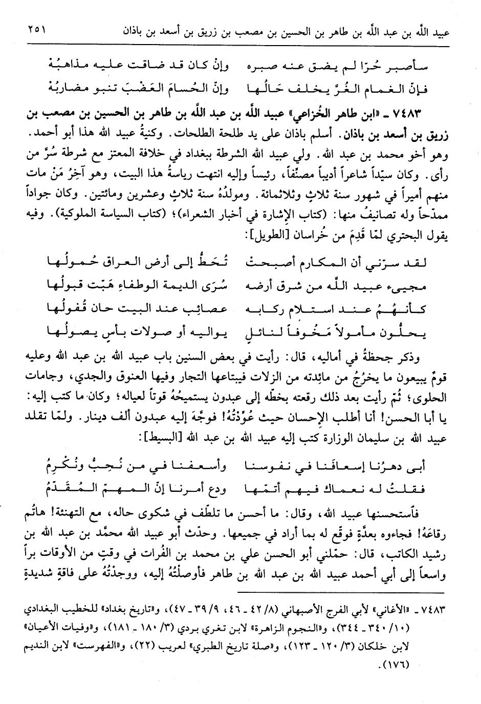 عبيد الله بن عبد الله بن طَاهِر بن الْحُسَيْن بن مُصعب بن زُرَيْق بن أسعد ابْن باذان أسلم باذان على يَد طَلْحَة الطلحات وكنية عبيد الله هَذَا أَبُو أَحْمد وَهُوَ أَخُو مُحَمَّد بن عبد الله ولي عبيد الله الشرطة بِبَغْدَاد فِي خلَافَة المعتز مَعَ شرطة سر من رأى وَكَانَ سيداً شَاعِرًا أديباً مصنفاُ رَئِيسا وَإِلَيْهِ انْتَهَت رياسة هَذَا الْبَيْت وَهُوَ آخر من مَاتَ مِنْهُم أَمِيرا فِي شهور سنة ثَلَاث وَثَلَاث ماية ومولده سنة ثَلَاث وَعشْرين ومايتين وَكَانَ جواداً ممدحاً وَله تصانيف مِنْهَا كتاب الْإِشَارَة فِي أَخْبَار الشُّعَرَاء كتاب السياسة الملوكية وَفِيه يَقُول البحتري لما قدم من خُرَاسَان