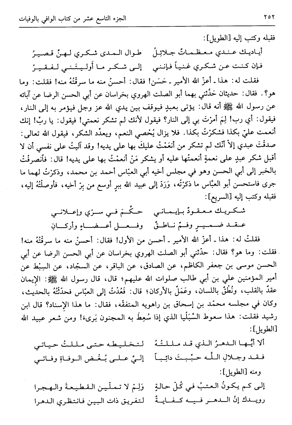 فَقلت لَهُ هاذ أعز الله الْأَمِير أحسن من الأول فَقَالَ أحسن مِنْهُ مَا سَرقته مِنْهُ فَقلت وَمَا هُوَ فَقَالَ حَدثنِي أَبُو الصَّلْت الْهَرَوِيّ بخراسان عَن أبي الرِّضَا عَن أبي الْحسن مُوسَى بن جَعْفَر الكاظم عَن الصَّادِق عَن الباقر عَن السَّجَّاد عَن السبط عَن أَمِير الْمُؤمنِينَ عَليّ بن أبي طَالب صلوَات الله عَلَيْهِم قَالَ قَالَ رَسُول الله صلّى الله عَلَيْهِ وَسلم الْإِيمَان عقد بِالْقَلْبِ ونطق بِاللِّسَانِ وَعمل بالأركان قَالَ فعدت إِلَى الْعَبَّاس فَحَدَّثته بِالْحَدِيثِ وَكَانَ فِي مَجْلِسه مُحَمَّد بن إِسْحَاق ابْن رَاهَوَيْه المتفقه فَقَالَ مَا هَذَا الْإِسْنَاد قَالَ ابْن رشيد فَقلت هَذَا سعوط السبليا الَّذِي إِذا سعط بِهِ الْمَجْنُون برِئ وَمن شعر عبيد الله)
