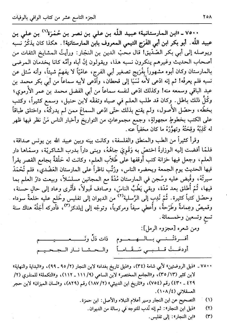 عبيد الله بن عَليّ بن نصر بن حمرَة بن عَليّ بن عبيد الله أَبُو بكر ابْن أبي الْفرج التَّيْمِيّ الْمَعْرُوف بِابْن المارستانية هَكَذَا كَانَ يذكر نسبه ويوصله إِلَى أبي بكر الصّديق قَالَ محب الدّين ابْن النجار وَرَأَيْت الْمَشَايِخ الثِّقَات من أَصْحَاب الحَدِيث وَغَيرهم يُنكرُونَ نسبه هَذَا وَيَقُولُونَ إِن أَبَاهُ وَأمه كَانَا يخدمان المرضى بالمارستان وَكَانَ أَبوهُ مَشْهُورا بفريج تَصْغِير أبي الْفرج عامياً لَا يفهم شَيْئا وَأَنه سُئِلَ عَن نسبه فَلم يعرفهُ ثمَّ إِنَّه ادّعى لأمه نسبا إِلَى قحطان وَادّعى لِأَبِيهِ سَمَاعا من أبي بكر مُحَمَّد بن عبد الْبَاقِي وسَمعه مِنْهُ وَكَذَلِكَ ادّعى لنَفسِهِ سَمَاعا من أبي الْفضل مُحَمَّد بن عمر الأرموي وكل ذَلِك بَاطِل وَكَانَ قد طلب الْعلم فِي صباه وتفقه لِابْنِ حَنْبَل وَسمع كثيرا وَكتب بِخَطِّهِ وَحصل الْأُصُول وَلم يقنع بذلك حَتَّى ادّعى السماع مِمَّن لم يُدْرِكهُ واختلق طباقاً على الْكتب بخطوط مَجْهُولَة وَجمع مجموعات من التواريخ وأخبار النَّاس من نظر فِيهَا ظهر لَهُ كذبة وقحته وتهوره مَا كَانَ مخفياً عَنهُ