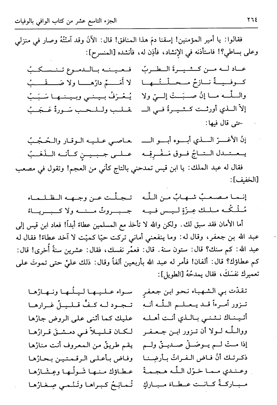 فَقَالُوا يَا أَمِير الْمُؤمنِينَ إسقنا دم هَذَا الْمُنَافِق قَالَ الْآن وَقد آمنته وَصَارَ فِي منزلي وعَلى بساطي فاستأذنه فِي الْإِنْشَاء فَأذن لَهُ فأنشده