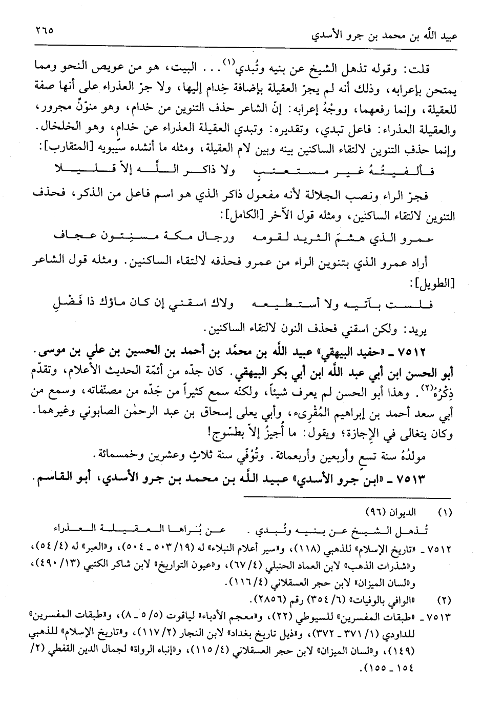 قلت وَقَوله تذهل الشَّيْخ عَن بنيه وتبدي الْبَيْت وَهُوَ من عويص النَّحْو وَمِمَّا يمْتَحن بإعرابه وَذَلِكَ أَنه لم يجر العقيلة بِإِضَافَة خدام إِلَيْهَا وَلَا جر الْعَذْرَاء على أَنَّهَا صفة للعقيلة وَإِنَّمَا رفعهما وَوجه إعرابه إِن الشَّاعِر حذف التَّنْوِين من خدام وَهُوَ منون مجرور والعقيلة الْعَذْرَاء فَاعل تبدي وَتَقْدِيره وتبدي العقيلة الْعَذْرَاء عَن خدام وَهُوَ الخلخال وَإِنَّمَا حذف التَّنْوِين لالتقاء الساكنين بَينه وَبَين لَام العقيلة وَمثله مَا أنْشدهُ سِيبَوَيْهٍ