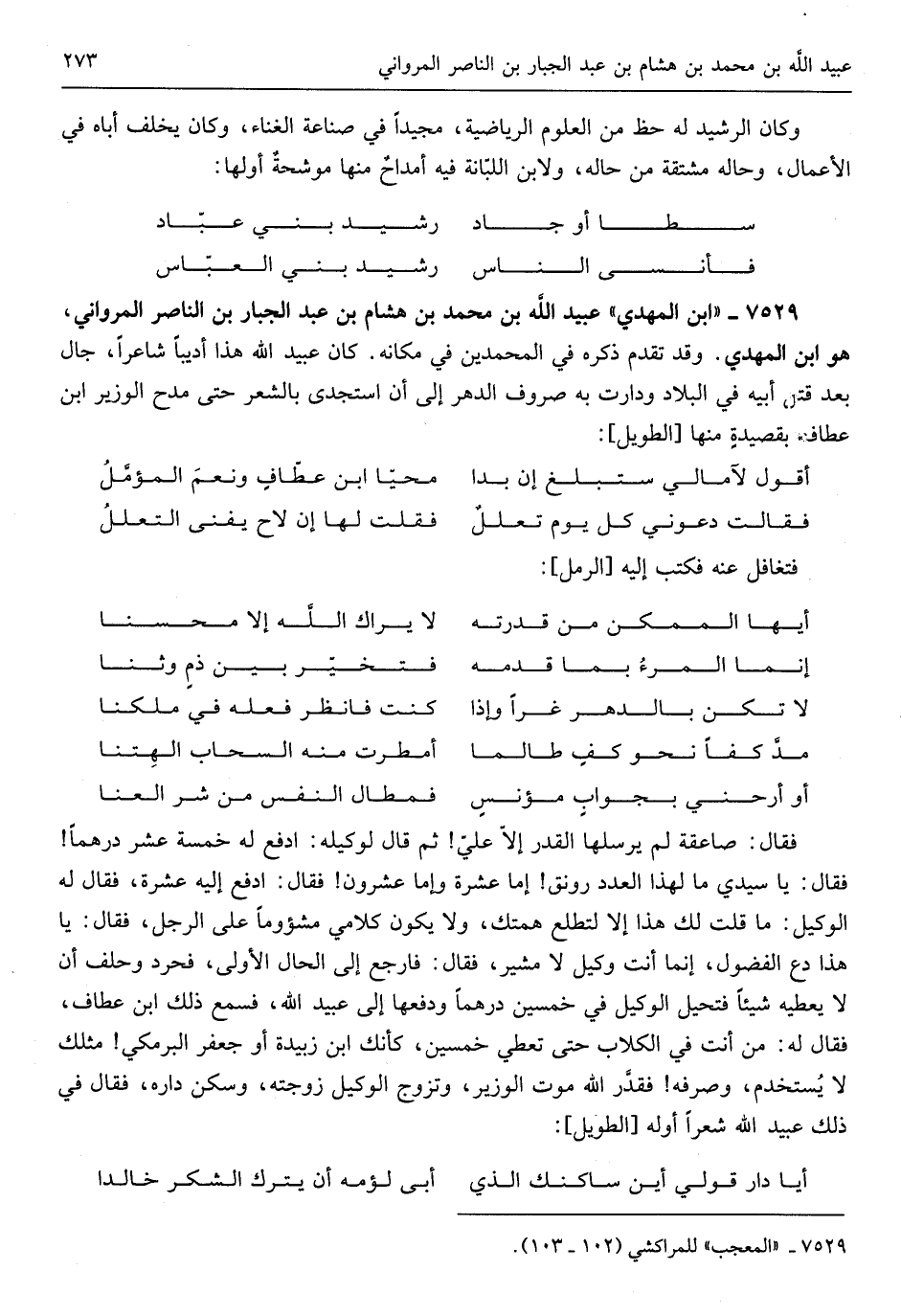 عبيد الله بن مُحَمَّد بن هِشَام بن عبد الْجَبَّار بن النَّاصِر المرواني هُوَ ابْن الْمهْدي وَقد تقدم ذكره فِي المحمدين فِي مَكَانَهُ كَانَ عبيد الله هَذَا أديباً شَاعِرًا جال بعد قتل أَبِيه فِي الْبِلَاد ودارت بِهِ صروف الدَّهْر إِلَى أَن استجدى بالشعر حَتَّى مدح الْوَزير ابْن عطاف بقصيدة