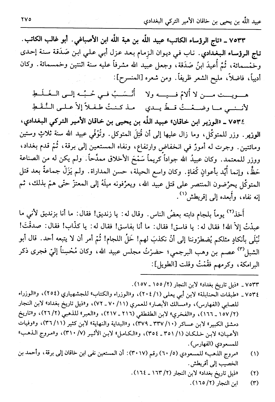 عبيد الله بن يحيى بن خاقَان الْأَمِير التركي الْبَغْدَادِيّ الْوَزير وزر للمتوكل وَمَا زَالَ عَلَيْهَا إِلَى أَن قتل المتَوَكل وَتُوفِّي عبيد اله سنة ثَلَاث وَسِتِّينَ وَمَا يتين وَجَرت لَهُ أُمُور فِي انخفاض وارتفاع ونفاه المستعين إِلَى برقة ثمَّ قدم بَغْدَاد ووزر للمعتمد وَكَانَ عبيد الله جواداً كَرِيمًا)