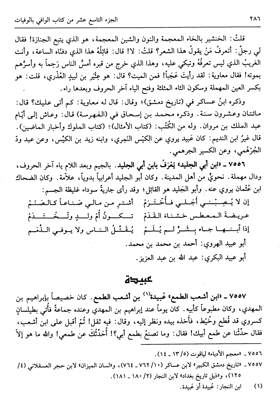 عُبَيْدَة بن أشعب الطمع كَانَ خصيصاً بإبراهيم بن الْمهْدي وَكَانَ مطبوعاً كأبيه كَانَ يَوْمًا عِنْد إِبْرَاهِيم بِمَ الْمهْدي وَعِنْده جمَاعَة فَأتي بطيلسان كسروي قد قطع وخيط فَأَخذه بِيَدِهِ وَنظر إِلَيْهِ وَقَالَ فِيهِ ثقل ثمَّ أقبل على ابْن أشعب فَقَالَ حَدثنَا عَن طمع أَبِيك فَقَالَ وَمَا تصنع أبي أحَدثك عَن طمعي وَالله مَا هُوَ