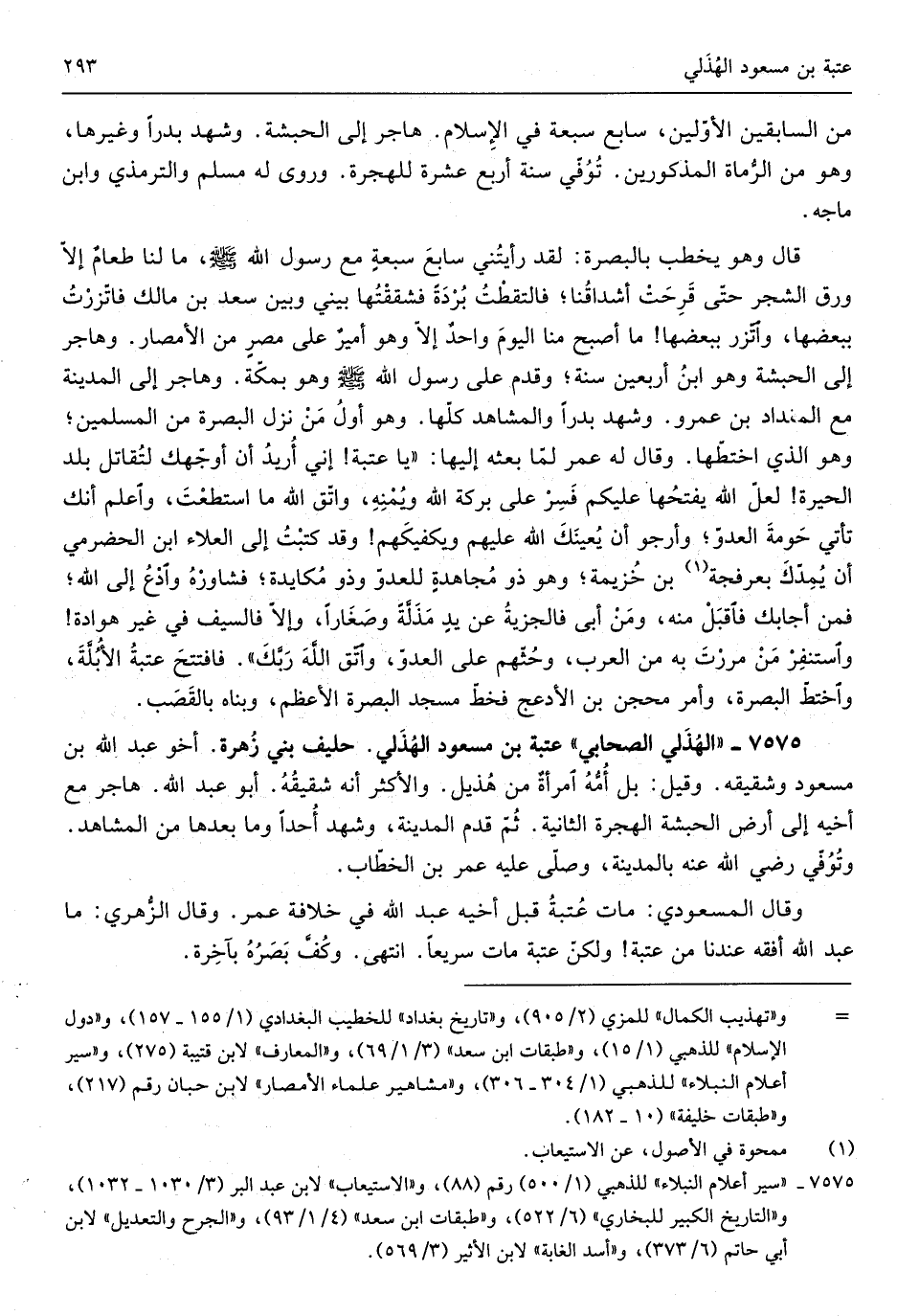 عتبَة بن مَسْعُود الْهُذلِيّ حَلِيف بني زهرَة أَخُو عبد الله بن مَسْعُود وشقيقه وَقيل بل أمه امْرَأَة من هُذَيْل وَالْأَكْثَر أَنه شقيقه أَبُو عبد الله هَاجر مَعَ أَخِيه إِلَى أَرض الْحَبَشَة الْهِجْرَة الثَّانِيَة ثمَّ قدم الْمَدِينَة وَشهد أحدا وَمَا بعْدهَا من الْمشَاهد وَتُوفِّي رَضِي الله عَنهُ بِالْمَدِينَةِ وَصلى عَلَيْهِ عمر بن الْخطاب