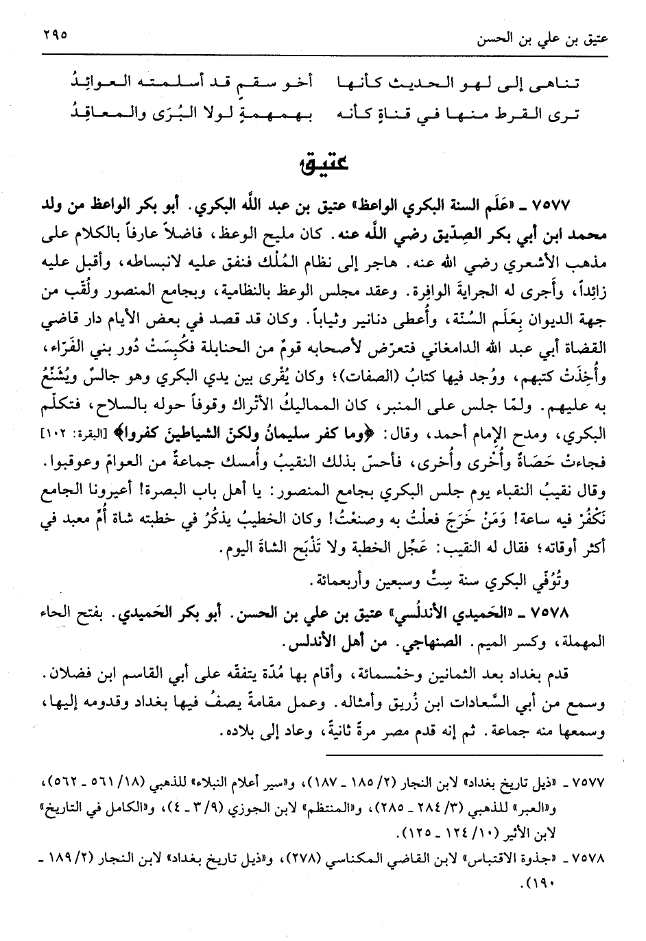 عَتيق بن عَليّ بن الْحسن أَبُو بكر الْحميدِي بِفَتْح الْحَاء الْمُهْملَة وَكسر الْمِيم الصنهاجي من أهل الأندلس قدم بَغْدَاد بعد الثَّمَانِينَ وَخمْس ماية وَأقَام بهَا مُدَّة يتفقه على أبي الْقَاسِم ابْن فضلان وَسمع من أبي السعادات ابْن زُرَيْق وَأَمْثَاله وَعمل مقامة يصف فِيهَا بَغْدَاد وقدومه إِلَيْهَا وسمعها مِنْهُ جمَاعَة ثمَّ إِنَّه قدم مصر مرّة ثَانِيَة وَعَاد إِلَى بِلَاده