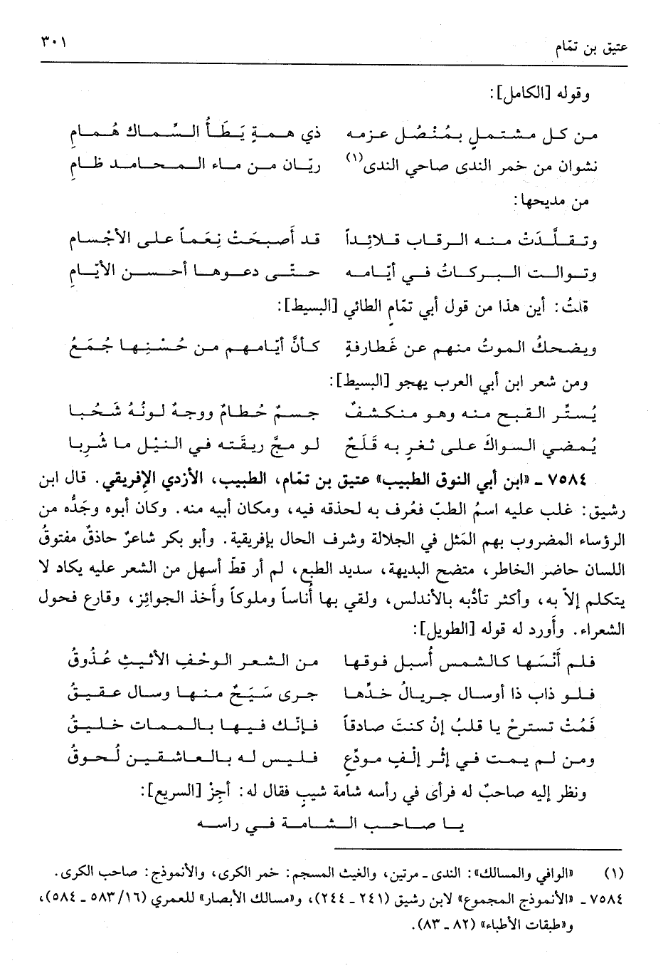 عَتيق ابْن تَمام الطَّبِيب الْأَزْدِيّ الإفْرِيقِي قَالَ ابْن رَشِيق غلب عَلَيْهِ اسْم الطِّبّ فَعرف بِهِ لحذقه فِيهِ وَمَكَان أَبِيه مِنْهُ وَكَانَ أَبوهُ وجده من الرؤساء الْمَضْرُوب بهم الْمثل فِي الْجَلالَة وَشرف الْحَال بإفريقية وَأَبُو بكر شَاعِر حاذق مفتوق اللِّسَان حَاضر الخاطر متضح البديهة سديد الطَّبْع لم أر قطّ أسهل من الشّعْر عَلَيْهِ يكَاد لَا يتَكَلَّم إِلَّا بِهِ وَأكْثر تأدبه بالأندلس وَلَقي بهَا أُنَاسًا وملوكاً وَأخذ الجوائز وقارع فحول الشُّعَرَاء وَأورد لَهُ قَوْله