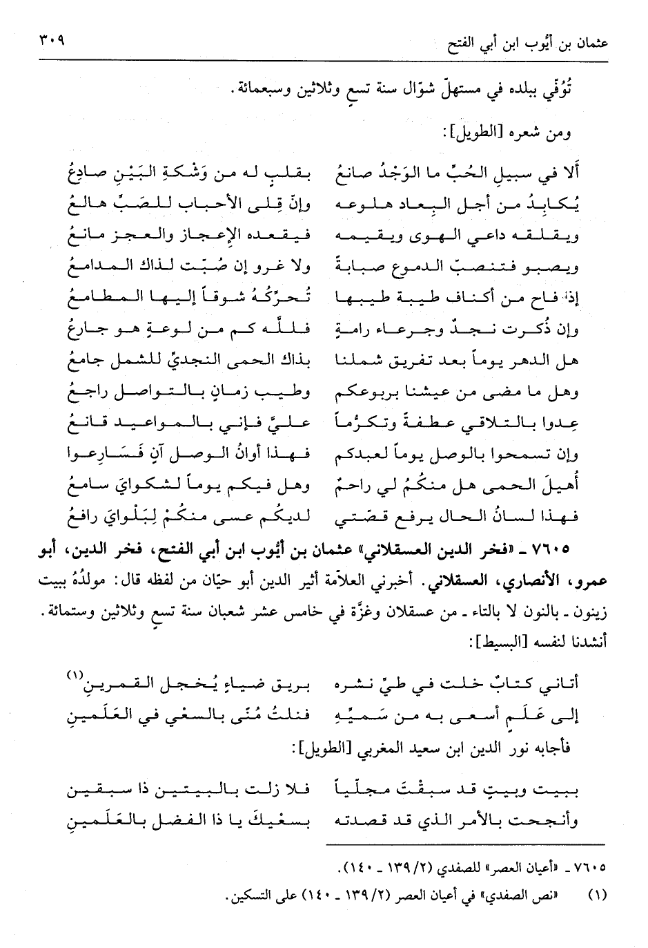 عُثْمَان بن أَيُّوب ابْن أبي الْفَتْح فَخر الدّين أَبُو عَمْرو الْأنْصَارِيّ الْعَسْقَلَانِي أَخْبرنِي العلاّمة أثير الدّين أَبُو حَيَّان من لَفظه قَالَ مولده بِبَيْت زينون بالنُّون لَا بِالتَّاءِ من عسقلان وغزة فِي خَامِس عشر شعْبَان سنة تسع وَثَلَاثِينَ وست ماية أنشدنا لنَفسِهِ