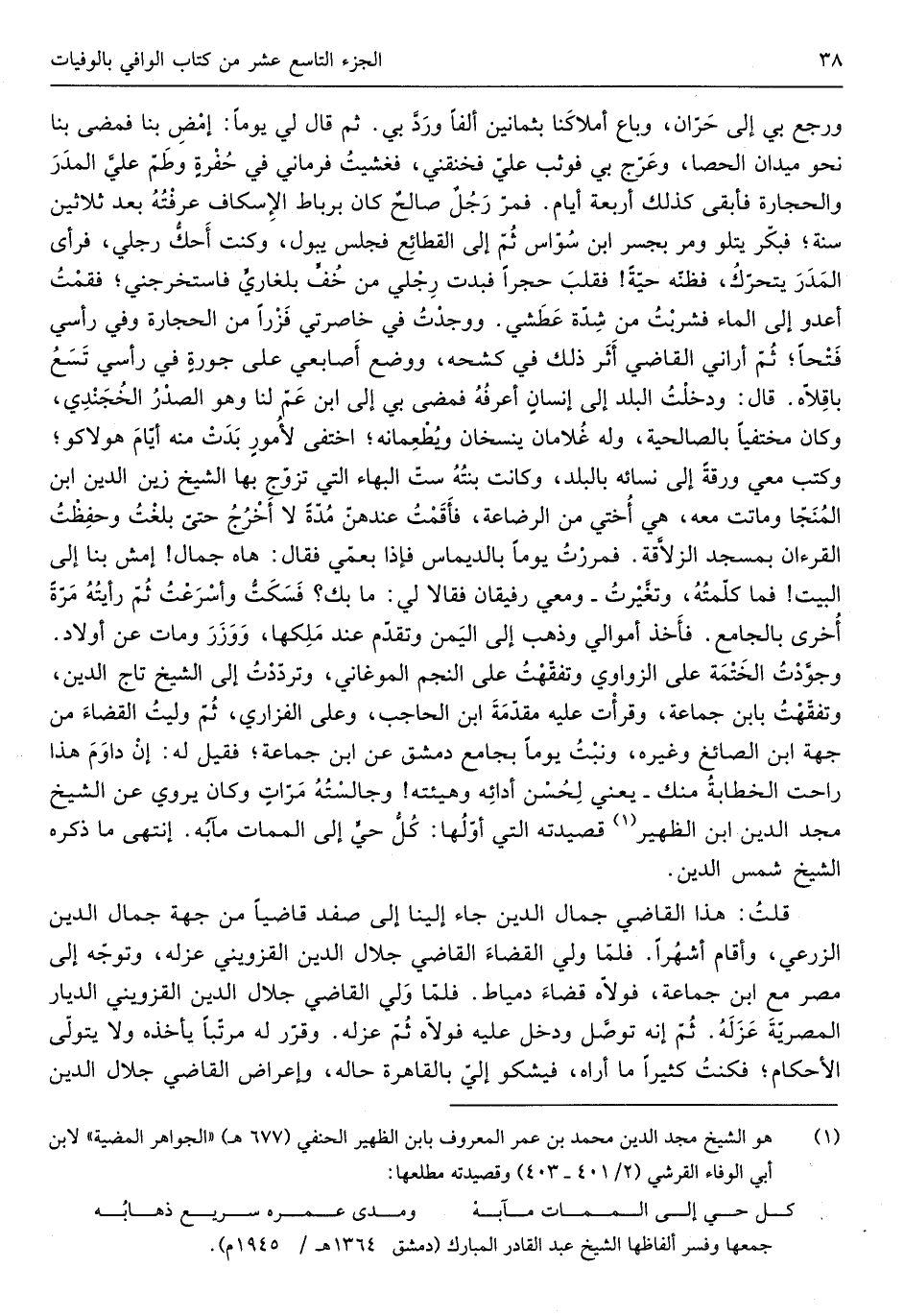 فَأخذ أَمْوَالِي وَذهب إِلَى الْيمن وَتقدم عِنْد ملكهَا ووزر وَمَات عَن أَوْلَاد وجودت الختمة على الزواوي تفقهت على النَّجْم الموغاني وترددت إِلَى الشَّيْخ تَاج الدّين وتفقهت بِابْن جمَاعَة وقرأت عَلَيْهِ مُقَدّمَة ابْن الْحَاجِب وعَلى الْفَزارِيّ ثمَّ وليت الْقَضَاء من جِهَة ابْن الصَّائِغ وَغَيره وَنبت يَوْمًا بِجَامِع دمشق عَن ابْن جمَاعَة فَقيل لَهُ إِن داوم هَذَا رحلت الخطابة مِنْك يَعْنِي لحسن أَدَائِهِ وهيئته وجالسته مَرَّات وَكَانَ يروي عَن الشَّيْخ مجد الدّين ابْن الظهير قصيدته الَّتِي أَولهَا كل حَيّ إِلَى الْمَمَات مآبه إنتهى مَا ذكره الشَّيْخ شمس الدّين