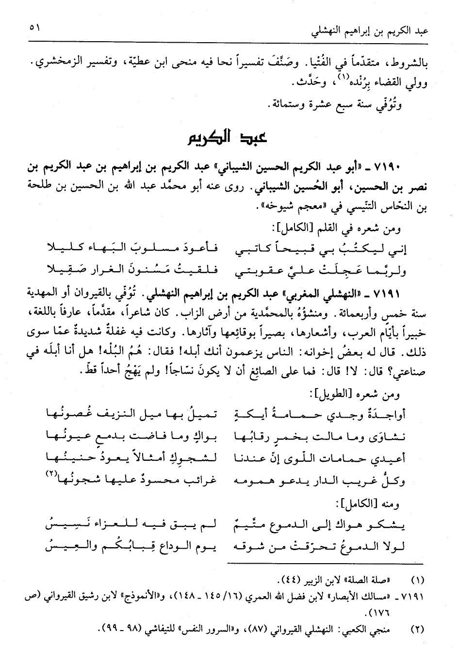 عبد الْكَرِيم بن إِبْرَاهِيم النَّهْشَلِي توفّي بالقيروان أَو المهدية سنة خمس وَأَرْبع ماية ومنشؤه بالمحمدية من أَرض الزاب كَانَ شَاعِرًا مقدما عَارِفًا باللغة خَبِيرا بأيام الْعَرَب وَأَشْعَارهَا بَصيرًا بوقائعها وآثارها وَكَانَت فِيهِ غَفلَة شَدِيدَة عَمَّا سوى ذَلِك قَالَ لَهُ بعض إخوانه النَّاس يَزْعمُونَ أَنَّك أبله فَقَالَ هم البله هَل أَنا أبله فِي صناعتي قَالَ لَا قَالَ فَمَا على الصَّائِغ أَن لَا يكون نساجاً وَلم يهج أحدا قطّ