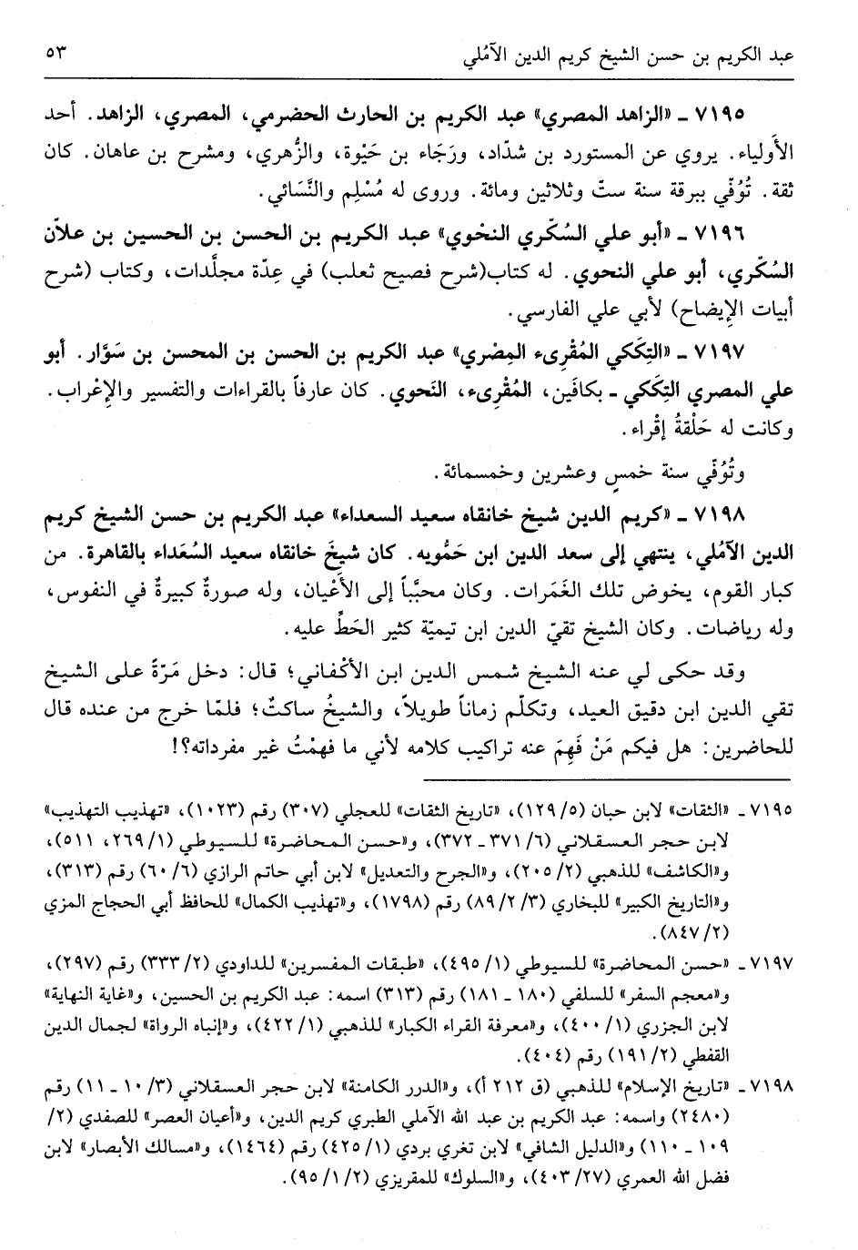 عبد الْكَرِيم بن حسن الشَّيْخ كريم الدّين الآملي يَنْتَهِي إِلَى سعد الدّين ابْن حمويه كَانَ شيخ خانقاه سعيد السُّعَدَاء بِالْقَاهِرَةِ من كبار الْقَوْم يَخُوض تِلْكَ الغمرات وَكَانَ محبباً إِلَى الْأَعْيَان وَله صُورَة كَبِيرَة فِي النُّفُوس وَله رياضات وَكَانَ الشَّيْخ تَقِيّ الدّين ابْن تَيْمِية كثير الْحَط عَلَيْهِ
