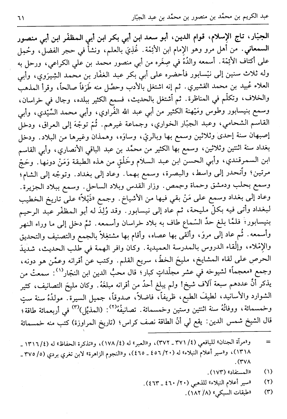 الْجَبَّار تَاج الْإِسْلَام قوام الدّين أَبُو سعد ابْن أبي بكر ابْن أبي المظفر ابْن أبي مَنْصُور السَّمْعَانِيّ من أهل مرو وَهُوَ الإِمَام ابْن الْأَئِمَّة