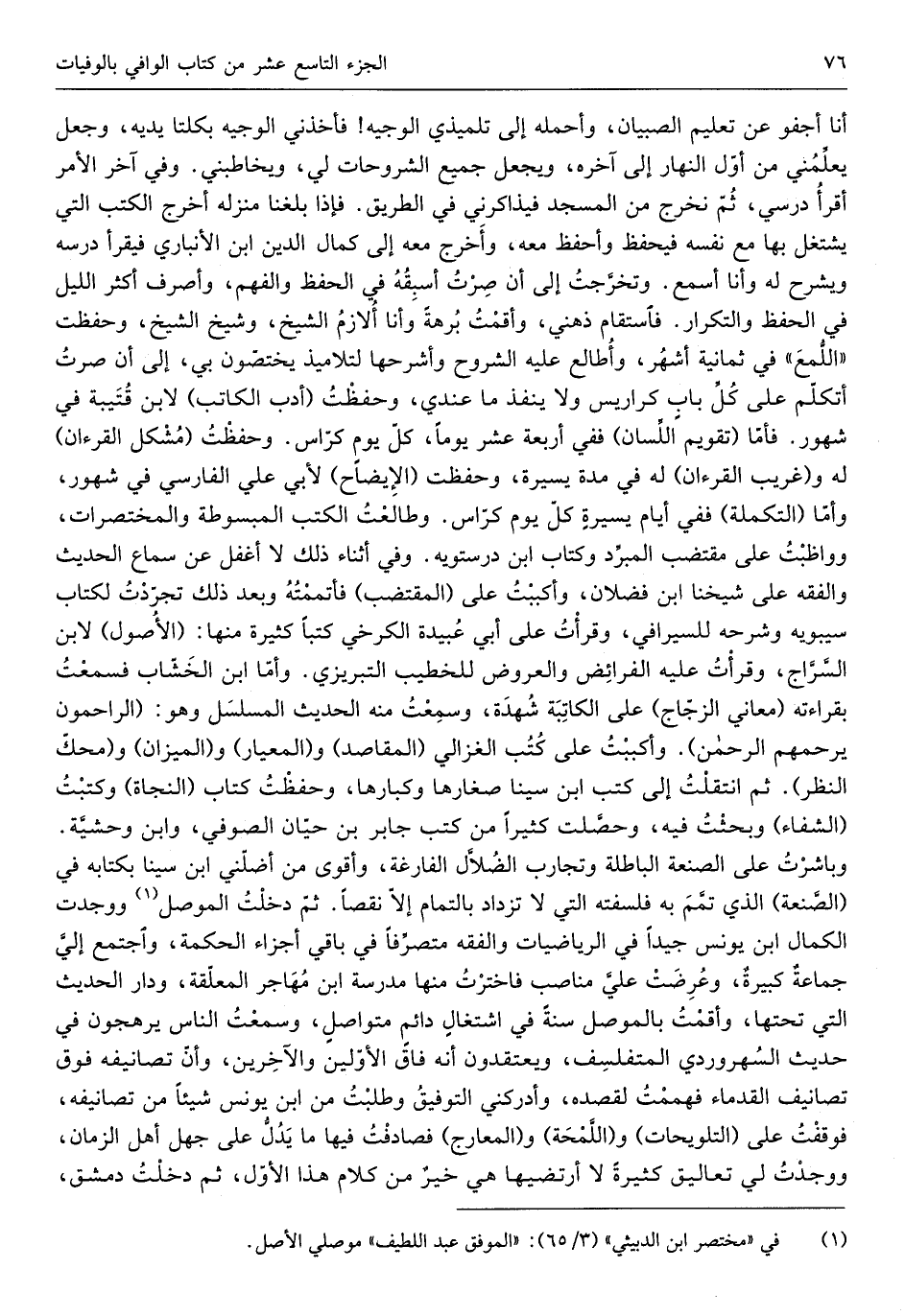 عَلَيْهِ الْفَرَائِض وَالْعرُوض للخطيب التبريزي وَأما ابْن الخشاب فَسمِعت بقرَاءَته مَعَاني الزّجاج على الكاتبة شهدة وَسمعت مِنْهُ الحَدِيث المسلسل وَهُوَ الراحمون يرحمهم الرَّحْمَن وأكببت على كتب الْغَزالِيّ الْمَقَاصِد والمعيار وَالْمِيزَان ومحك النّظر ثمَّ انْتَقَلت إِلَى كتب ابْن سينا صغارها وكبارها وحفظت كتاب النجَاة وكتبت الشِّفَاء وبحثت فِيهِ وحصلت كثيرا من كتب جَابر بن حَيَّان الصُّوفِي وَابْن وحشية وباشرت على الصَّنْعَة الْبَاطِلَة وتجارب الضلال الفارغة وَأقوى من أضلني ابْن سينا بكتابه فِي الصَّنْعَة الَّذِي تمم بِهِ فلسفته الَّتِي لَا تزداد بالتمام إِلَّا نقصا ثمَّ دخلت الْموصل وَوجدت الْكَمَال ابْن يُونُس جيدا فِي الرياضيات وَالْفِقْه متصرفاً فِي بَاقِي أَجزَاء الْحِكْمَة وَاجْتمعَ إِلَيّ جمَاعَة كَبِيرَة وَعرضت عَليّ مناصب فاخترت مِنْهَا مدرسة ابْن مهَاجر الْمُعَلقَة وَدَار الحَدِيث الَّتِي تحتهَا وأقمت بالموصل سنة فِي اشْتِغَال دَائِم ومتواصل وَسمعت النَّاس يرهجون فِي حَدِيث السهروردي المتفلسف ويعتقدون أَنه فاق الْأَوَّلين والآخرين وَأَن تصانيفه فَوق تصانيف القدماء فهممت لقصده وأدركني التَّوْفِيق وَطلبت من ابْن يُونُس شَيْئا من تصانيفه فوقفت على التلويحات واللمحة والمعارج فصادفت فِيهَا مَا يدل على جهل أهل الزَّمَان وَوجدت لي تعاليق كَثِيرَة لَا أرتضيها هِيَ خير من كَلَام هَذَا الأول ثمَّ دخلت دمشق