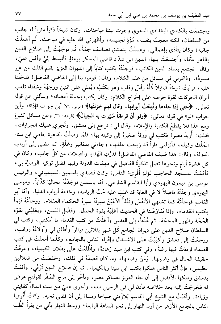 وَاجْتمعت بالكندي الْبَغْدَادِيّ النَّحْوِيّ وَجَرت بَيْننَا مباحثات وَكَانَ شَيخا ذكياً مثرياً لَهُ جَانب من السُّلْطَان لكنه معجب بِنَفسِهِ مؤذ لجليسه وأظهرني الله عَلَيْهِ فِي مبَاحث ثمَّ أهملت جَانِبه وَكَانَ يتَأَذَّى بإهمالي وعملت بِدِمَشْق تصانيف جمة ثمَّ تَوَجَّهت إِلَى صَلَاح الدّين بِظَاهِر عكا وَاجْتمعت ببهاء الدّين ابْن شَدَّاد قَاضِي الْعَسْكَر يَوْمئِذٍ فانبسط إِلَيّ وَأَقْبل عَليّ وَقَالَ تَجْتَمِع بعماد الدّين الْكَاتِب فَوَجَدته يكْتب كتابا إِلَى الدِّيوَان الْعَزِيز بقلم الثُّلُث من غير مسودة وذاكرني فِي مسَائِل من علم الْكَلَام وَقَالَ قومُوا بِنَا إِلَى القَاضِي الْفَاضِل فَدَخَلْنَا عَلَيْهِ فَرَأَيْت شَيخا ضئيلاً كُله رَأس وقلب وَهُوَ يكْتب ويملي على اثْنَيْنِ وَوَجهه وشفتاه تلعب ألوان الحركات لقُوَّة حرصه على إِخْرَاج الْكَلَام وَكَانَ يكْتب بجملة أَعْضَائِهِ وسألني عَن قَوْله تَعَالَى حَتَّى إِذا جاءها وَفتحت أَبْوَابهَا وَقَالَ لَهُم خزنتها أَيْن جَوَاب إِذا وَأَيْنَ جَوَاب لَو فِي قَوْله تَعَالَى وَلَو أَن قُرْآنًا سيرت بِهِ الْجبَال وَعَن مسَائِل كَثِيرَة وَمَعَ هَذَا فَلَا يقطع الْكِتَابَة والإملاء وَقَالَ لي ترجع إِلَى دمشق وتجرى عَلَيْك الجرايات فَقلت أُرِيد مصر فَكتب لي ورقة صَغِيرَة إِلَى وَكيله لَهَا فَلَمَّا وصلت الْقَاهِرَة جَاءَنِي ابْن سناء الْملك)