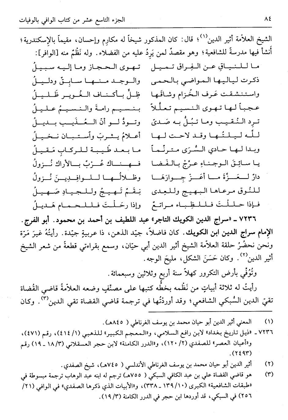 عبد اللَّطِيف بن أَحْمد بن مَحْمُود أَبُو الْفرج الإِمَام سراج الدّين ابْن الكويك كَانَ فَاضلا جيد الذِّهْن ذَا عَرَبِيَّة جَيِّدَة رَأَيْته غير مرّة وَنحن نحضر حَلقَة الْعَلامَة الشَّيْخ أثير الدّين أبي حَيَّان وَسمع بِقِرَاءَتِي قِطْعَة من شعر الشَّيْخ أثير الدّين وَكَانَ حسن الشكل مليح الْوَجْه