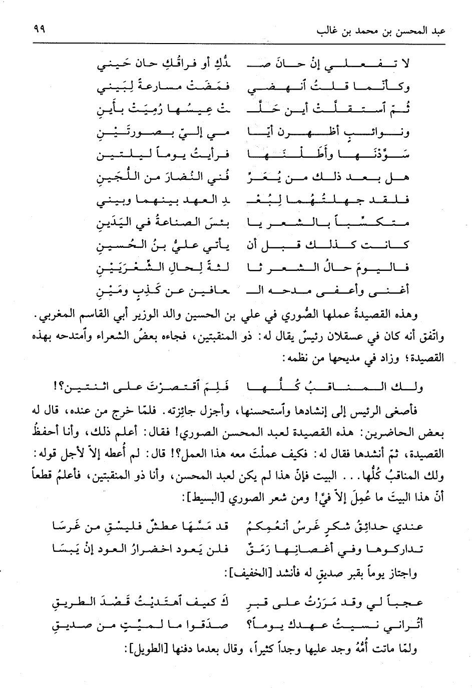 فأصغى الرئيس إِلَى إنشادها واستحسنها وأجزل جائزته فَلَمَّا خرج من عِنْده قَالَ لَهُ بعض الْحَاضِرين هَذِه القصيدة لعبد المحسن الصُّورِي فَقَالَ أعلم ذَلِك وَأَنا أحفظ القصيدة ثمَّ أنشدها فَقَالَ لَهُ فَكيف عملت مَعَه هَذَا الْعَمَل قَالَ لم أعْطه إِلَّا لأجل قَوْله وَلَك المناقب كلهَا الْبَيْت فَإِن هَذَا لم يكن عبد المحسن وَأَنا ذُو المنقبين فَأعْلم قطعا أَن هَذَا الْبَيْت مَا عمل إِلَّا فِي وَمن شعر الصُّورِي
