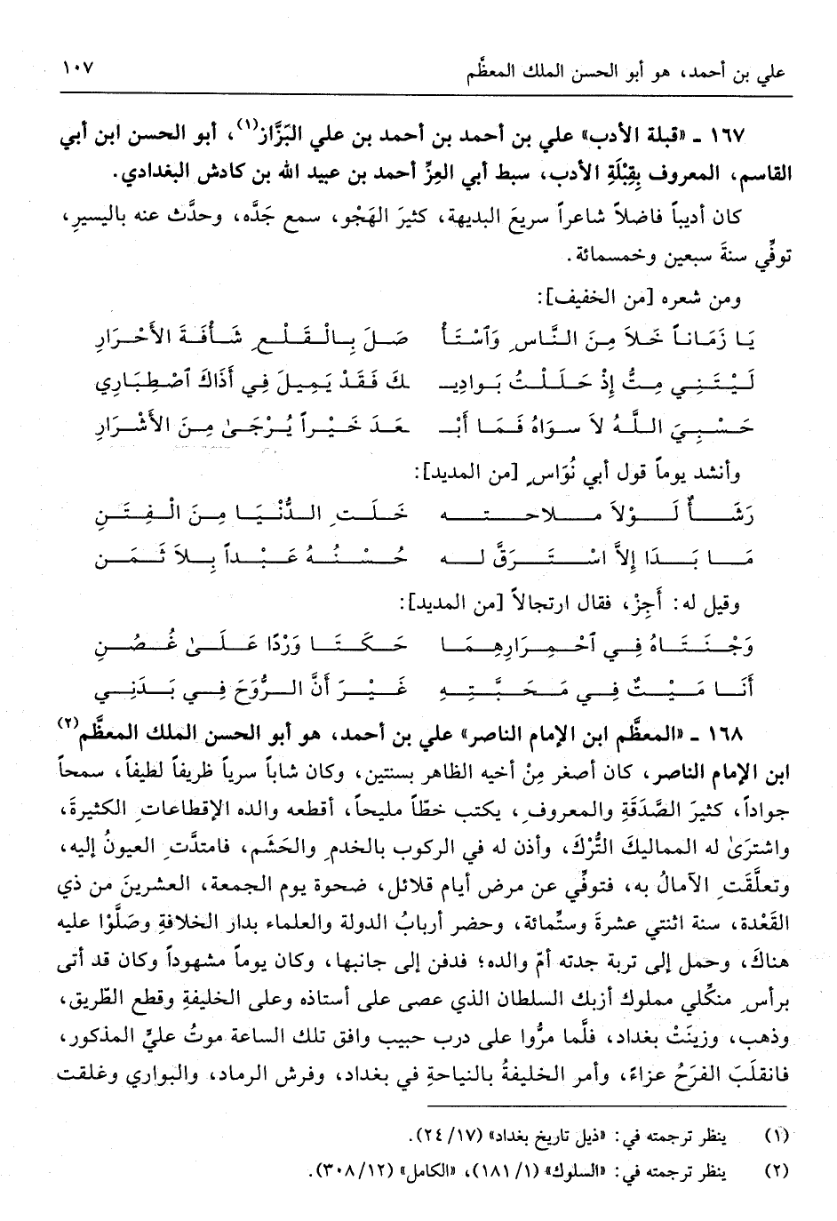 168 - الْمُعظم ابْن الإِمَام النَّاصِر عَليّ بن أَحْمد هُوَ أَبُو الْحسن الْملك الْمُعظم ابْن الإِمَام النَّاصِر كَانَ أَصْغَر من أَخِيه الظَّاهِر بِسنتَيْنِ وَكَانَ شَابًّا سريا ظريفا لطيفا سَمحا جوادا كثير الصَّدَقَة وَالْمَعْرُوف يكْتب خطا مليحا أقطعه وَالِده الإقطاعات الْكَثِيرَة وَاشْترى لَهُ المماليك التّرْك وَأذن لَهُ فِي الرّكُوب بالخدم والحشم فامتدت الْعُيُون إِلَيْهِ وتعلقت الآمال بِهِ فَتوفي عَن مرض أَيَّام قَلَائِل ضحوة يَوْم الْجُمُعَة الْعشْرين من ذِي الْقعدَة سنة اثْنَتَيْ عشرَة وسِتمِائَة وَحضر أَرْبَاب الدولة وَالْعُلَمَاء بدار الْخلَافَة وصلوا عَلَيْهِ هُنَاكَ وَحمل إِلَى تربة جدته أم وَالِده فَدفن إِلَى جَانبهَا وَكَانَ يَوْمًا مشهودا وَكَانَ قد أَتَى بِرَأْس منكلي مَمْلُوك أزبك السُّلْطَان الَّذِي عصى على أستاذه وعَلى الْخَلِيفَة وَقطع الطَّرِيق وَذهب وزينت بَغْدَاد فَلَمَّا مروا على درب حبيب وَافق تِلْكَ السَّاعَة موت عَليّ الْمَذْكُور فَانْقَلَبَ الْفَرح عزاء وَأمر الْخَلِيفَة بالنياحة فِي بَغْدَاد وفرش الرماد والبواري وغلقت