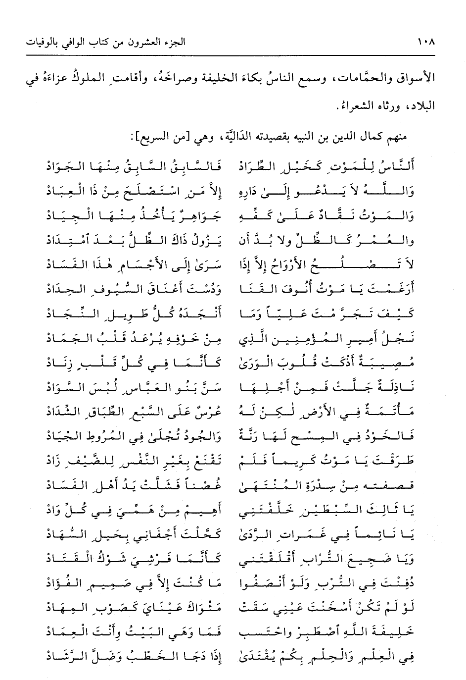 الْأَسْوَاق والحمامات وَسمع النَّاس بكاء الْخَلِيفَة وصراخه وأقامت الْمُلُوك عزاءه فِي الْبِلَاد ورثاه الشُّعَرَاء مِنْهُم كَمَال الدّين بن النبيه بقصيدته الدالية وَهِي // (من السَّرِيع) //