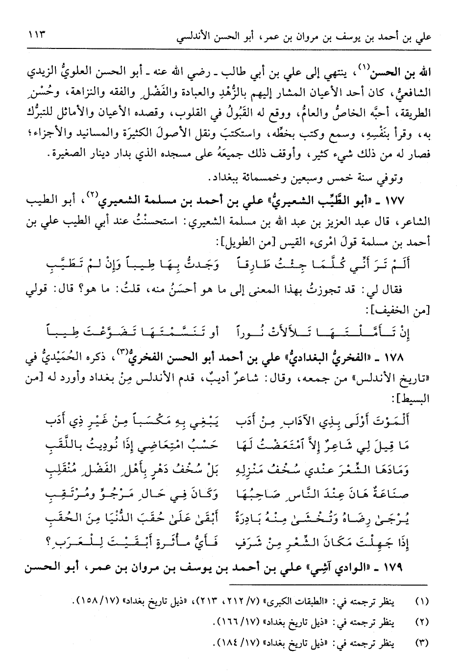 178 - الفخري الْبَغْدَادِيّ عَليّ بن أَحْمد أَبُو الْحسن الفخري ذكره الْحميدِي فِي تَارِيخ الأندلس من جمعه وَقَالَ شَاعِر أديب قدم الأندلس من بَغْدَاد وَأورد لَهُ // (من الْبَسِيط) //