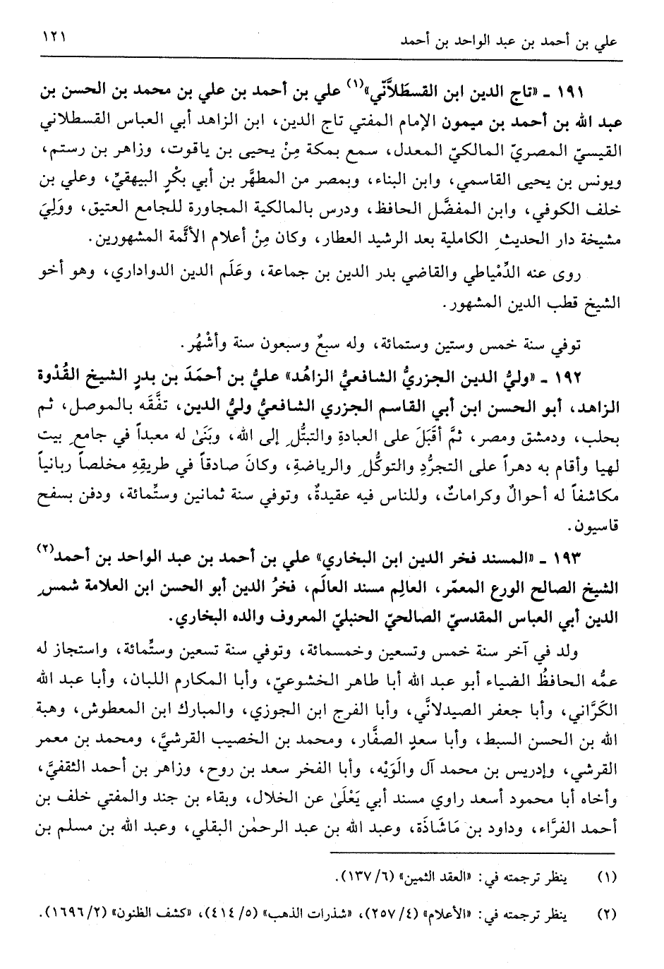 191 - تَاج الدّين ابْن الْقُسْطَلَانِيّ عَليّ بن أَحْمد بن عَليّ بن مُحَمَّد بن الْحسن بن عبد الله بن أَحْمد بن مَيْمُون الإِمَام الْمُفْتِي تَاج الدّين ابْن الزَّاهِد أبي الْعَبَّاس الْقُسْطَلَانِيّ الْقَيْسِي الْمصْرِيّ الْمَالِكِي الْمعدل سمع بِمَكَّة من يحيى بن ياقوت وزاهر بن رستم وَيُونُس بن يحيى القاسمي وَابْن الْبناء وبمصر من المطهر بن أبي بكر الْبَيْهَقِيّ وَعلي بن مشيخة دَار الحَدِيث الكاملية بعد الرشيد الْعَطَّار وَكَانَ من أَعْلَام الْأَئِمَّة الْمَشْهُورين روى عَنهُ الدمياطي وَالْقَاضِي بدر الدّين بن جمَاعَة وَعلم الدّين الدواداري وَهُوَ أَخُو الشَّيْخ قطب الدّين الْمَشْهُور توفّي سنة خمس وَسِتِّينَ وسِتمِائَة وَله سبع وَسَبْعُونَ سنه وَأشهر