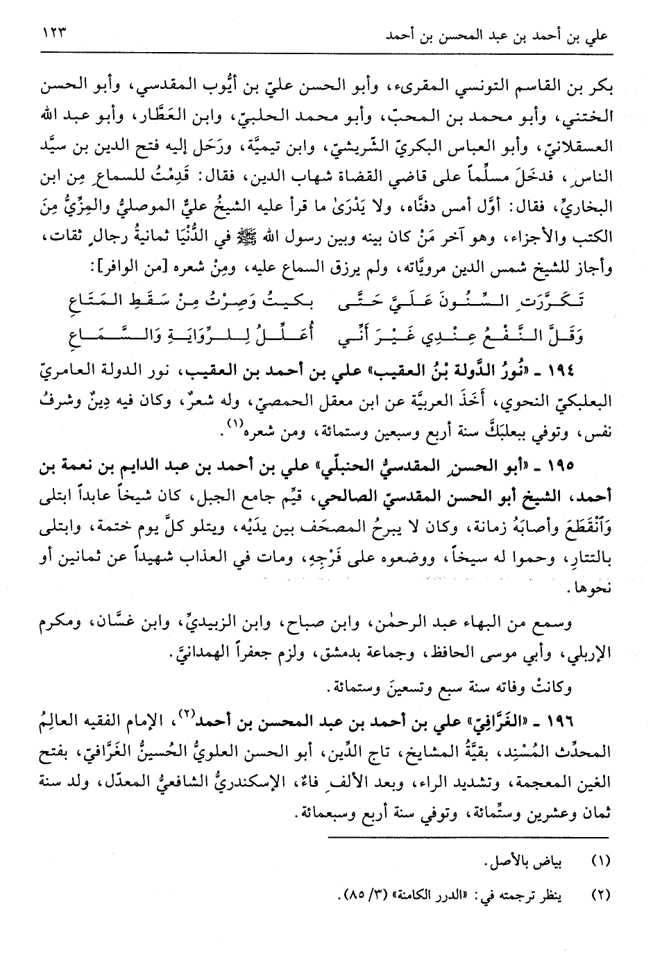 194 - نور الدولة بن العقيب عَليّ بن أَحْمد بن العقيب نور الدولة العامري البعلبكي النَّحْوِيّ أَخذ الْعَرَبيَّة عَن ابْن معقل الْحِمصِي وَله شعر وَكَانَ فِيهِ دين وَشرف نفس وَتُوفِّي ببعلبك سنة أَربع وَسبعين وسِتمِائَة وَمن شعره