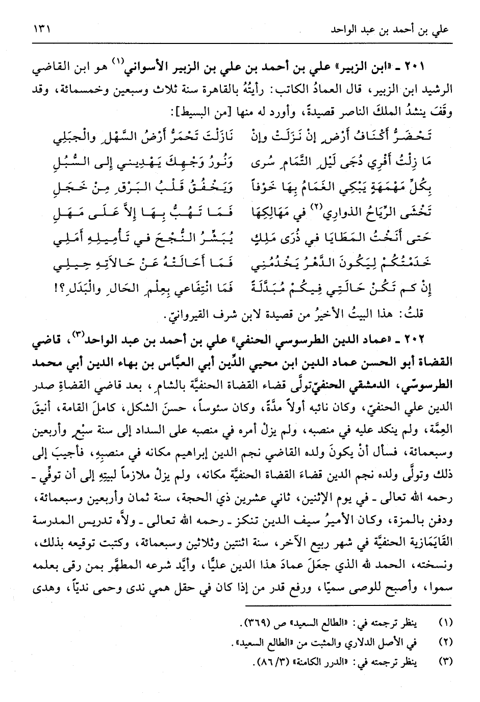 201 - ابْن الزبير عَليّ بن أَحْمد بن عَليّ بن الزبير الأسواني هُوَ ابْن القَاضِي الرشيد ابْن الزبير قَالَ الْعِمَاد الْكَاتِب رَأَيْته بِالْقَاهِرَةِ سنة ثَلَاث وَسبعين وَخَمْسمِائة وَقد وقف ينشد الْملك النَّاصِر قصيدة وَأورد لَهُ مِنْهَا // (من الْبَسِيط) //