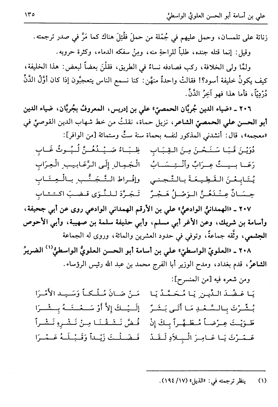206 - ضِيَاء الدّين جربان الْحِمصِي عَليّ بن إِدْرِيس الْمَعْرُوف بجربان ضِيَاء الدّين أَبُو الْحسن عَليّ الْحِمصِي الشَّاعِر نزيل حماة نقلت من خطّ شهَاب الدّين القوصي فِي مُعْجَمه قَالَ أَنْشدني الْمَذْكُور لنَفسِهِ بحماة سنة سِتّ وسِتمِائَة // (من الوافر) //