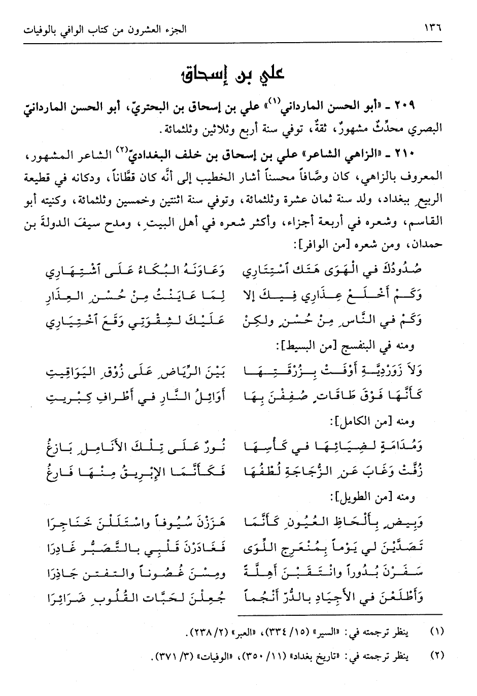 210 - الزاهي الشَّاعِر عَليّ بن إِسْحَاق بن خلف الْبَغْدَادِيّ الشَّاعِر الْمَشْهُور الْمَعْرُوف بالزاهي كَانَ وصافا محسنا أَشَارَ الْخَطِيب إِلَى أَنه كَانَ قطانا ودكانه فِي قطيعة الرّبيع بِبَغْدَاد ولد سنة ثَمَان عشرَة وثلثمائة وَتُوفِّي سنة اثْنَتَيْنِ وَخمسين وثلثمائة وكنيته أَبُو الْقَاسِم وشعره فِي أَرْبَعَة أَجزَاء وَأكْثر شعره فِي أهل الْبَيْت ومدح سيف الدولة بن حمدَان وَمن شعره // (من الوافر) //