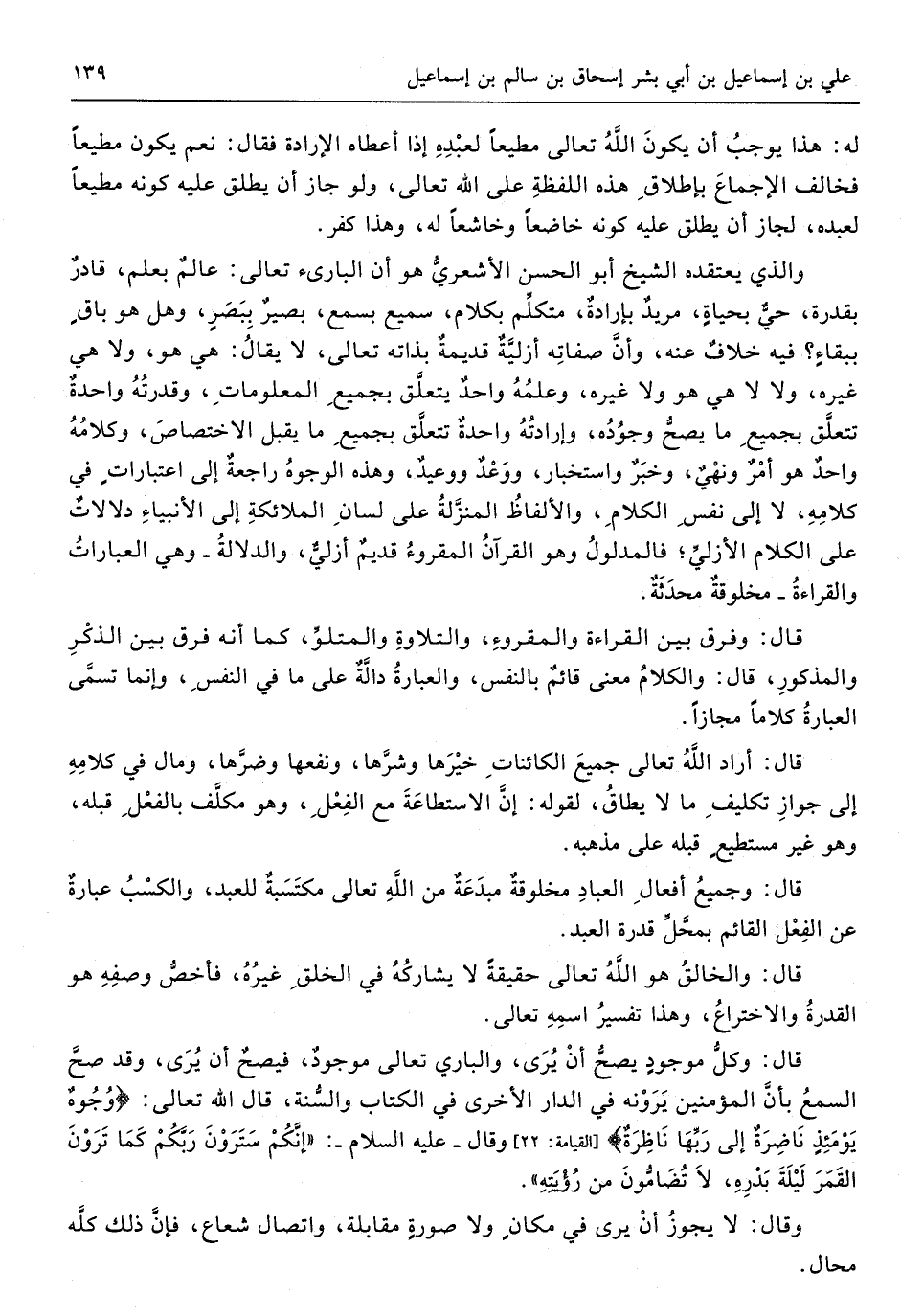 لَهُ هَذَا يُوجب أَن يكون الله تَعَالَى مُطيعًا لعَبْدِهِ إِذا أعطَاهُ الْإِرَادَة فَقَالَ نعم يكون مُطيعًا فَخَالف الْإِجْمَاع بِإِطْلَاق هَذِه اللَّفْظَة على الله تَعَالَى وَلَو جَازَ أَن يُطلق عَلَيْهِ كَون مُطيعًا لعَبْدِهِ لجَاز أَن يُطلق عَلَيْهِ كَونه خاضعا وخاشعا لَهُ وَهَذَا كفر وَالَّذِي يَعْتَقِدهُ الشَّيْخ أَبُو الْحسن الْأَشْعَرِيّ هُوَ أَن البارئ تَعَالَى عَالم بِعلم قَادر بقدرة حَيّ بحياة مريدة بِإِرَادَة مُتَكَلم بِكَلَام سميع بسمع بَصِير ببصر وَهل هُوَ بَاقٍ بِبَقَاء فِيهِ خلاف عَنهُ وَأَن صِفَاته أزلية قديمَة بِذَاتِهِ تَعَالَى لَا يُقَال هِيَ هُوَ وَلَا هِيَ غَيره وَلَا لَا هِيَ هُوَ وَلَا غَيره وَعلمه وَاحِد يتَعَلَّق بِجَمِيعِ المعلومات وَقدرته وَاحِدَة تتَعَلَّق بِجَمِيعِ مَا يَصح وجوده وإرادته وَاحِدَة تتَعَلَّق بِجَمِيعِ مَا يقبل الِاخْتِصَاص وَكَلَامه وَاحِد هُوَ أَمر وَنهي وَخبر واستخبار ووعد ووعيد وَهَذِه الْوُجُوه رَاجِعَة إِلَى اعتبارات فِي كَلَامه لَا إِلَى نفس الْكَلَام والألفاظ الْمنزلَة على لِسَان الْمَلَائِكَة إِلَى الْأَنْبِيَاء دلالات على الْكَلَام الأزلي فالمدلول وَهُوَ الْقُرْآن المقروء قديم أزلي وَالدّلَالَة وَهِي الْعبارَات وَالْقِرَاءَة مخلوقة محدثة قَالَ وَفرق بَين الْقِرَاءَة والمقروء والتلاوة والمتلو كَمَا انه فرق بَين الذّكر وَالْمَذْكُور قَالُوا الْكَلَام معنى قَائِم بِالنَّفسِ والعبارة دَالَّة على مَا فِي النَّفس وَإِنَّمَا تسمى الْعبارَة كلَاما مجَازًا قَالَ أَرَادَ الله تَعَالَى جَمِيع الكائنات خَيرهَا وشرها ونفعها وضرها وَمَال فِي كَلَامه إِلَى جَوَاز تَكْلِيف مَا لَا يُطَاق لقَوْله إِن الِاسْتِطَاعَة مَعَ الْفِعْل وَهُوَ مُكَلّف بِالْفِعْلِ قبله وَهُوَ غير مستطيع قبله على مذْهبه قَالَ وَجَمِيع أَفعَال الْعباد مخلوقة مبدعة من الله تَعَالَى متكتبسة للْعَبد وَالْكَسْب عبارَة عَن الْفِعْل الْقَائِم بِمحل قدرَة العَبْد قَالَ والخالق هُوَ الله تَعَالَى حَقِيقَة لَا يُشَارِكهُ فِي الْخلق غَيره فأخص وَصفه هُوَ الْقُدْرَة والاختراع وَهَذَا تَفْسِير اسْمه تَعَالَى قَالَ وكل مَوْجُود يَصح أَن يرى والباري تَعَالَى مَوْجُود فَيصح أَن يرى وَقد صَحَّ السّمع بِأَن الْمُؤمنِينَ يرونه فِي الدَّار الْأُخْرَى فِي الْكتاب وَالسّنة قَالَ الله تَعَالَى {وُجُوه يَوْمئِذٍ ناضرة إِلَى رَبهَا ناظرة} [الْقِيَامَة 22] وَقَالَ عَلَيْهِ السَّلَام إِنَّكُم سَتَرَوْنَ ربكُم كَمَا ترَوْنَ الْقَمَر لَيْلَة بدره لَا تضَامون من رُؤْيَته وَقَالَ لَا يجوز أَن يرى فِي مَكَان وَلَا صُورَة مُقَابلَة واتصال شُعَاع فان ذَلِك كُله محَال