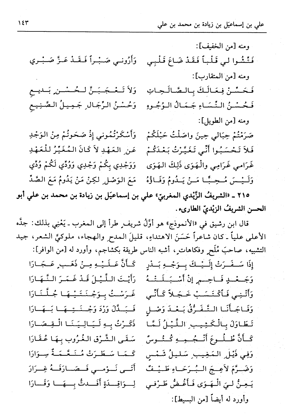 215 - الشريف الزيدي المغربي عَليّ بن إِسْمَاعِيل بن زِيَادَة بن مُحَمَّد بن عَليّ أَبُو الْحسن الشريف الزيدي الطَّارِئ قَالَ ابْن رَشِيق فِي الأنموذج هُوَ أول شرِيف طَرَأَ إِلَى الْمغرب يَعْنِي بذلك جده الْأَعْلَى عليا كَانَ شَاعِرًا حسن الاهتداء قَلِيل الْمَدْح والهجاء ملوكي الشّعْر جيد التَّشْبِيه صَاحب ملح وفكاهات أشبه النَّاس طَريقَة بكشاجم وَأورد لَهُ // (من الوافر) //