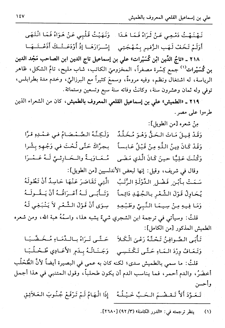 قلت وَسَيَأْتِي فِي تَرْجَمَة ابْن الشجري شَيْء يشبه هَذَا واسْمه هبة الله وَمن شعره الطميش الْمَذْكُور // (من الْكَامِل) //