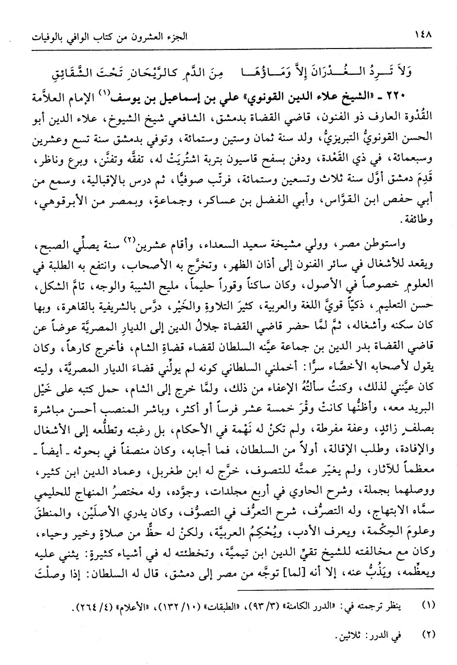 220 - الشَّيْخ عَلَاء الدّين القونوي عَليّ بن إِسْمَاعِيل بن يُوسُف الإِمَام الْعَلامَة الْقدْوَة الْعَارِف ذُو الْفُنُون قَاضِي الْقُضَاة بِدِمَشْق الشَّافِعِي شيخ الشُّيُوخ عَلَاء الدّين أَبُو الْحسن القونوي التبريزي ولد سنة ثَمَان وَسِتِّينَ وسِتمِائَة وَتُوفِّي بِدِمَشْق سنة تسع وَعشْرين وَسَبْعمائة فِي ذِي الْقعدَة وَدفن بسفح قاسيون بتربة اشْتريت لَهُ تفقه وتفنن وبرع وناظر قدم دمشق أول سنة ثَلَاث وَتِسْعين وسِتمِائَة فرتب صوفيا ثمَّ درس بالإقبالية وَسمع من أبي حَفْص ابْن القواس وَأبي الْفضل بن عَسَاكِر وَجَمَاعَة وبمصر من الأبرقوهي وَطَائِفَة واستوطن مصر وَولي مشيخة سعيد السُّعَدَاء وَأقَام عشْرين سنة يصلى الصُّبْح وَيقْعد للاشتغال فِي سَائِر الْفُنُون إِلَى أَذَان الظّهْر وَتخرج بِهِ الْأَصْحَاب وانتفع بِهِ الطّلبَة فِي الْعُلُوم خُصُوصا فِي الْأُصُول وَكَانَ سَاكِنا وقورا حَلِيمًا مليح الشيبة وَالْوَجْه تَامّ الشكل حسن التَّعْلِيم ذكيا قوي اللُّغَة والعربية كثير التِّلَاوَة وَالْخَيْر درس بالشريفية بِالْقَاهِرَةِ وَبهَا كَانَ سكنه وأشغاله ثمَّ لما حضر قَاضِي الْقُضَاة جلال الدّين إِلَى الديار المصرية عوضا عَن قَاضِي الْقُضَاة بدر الدّين بن جمَاعَة عينه السُّلْطَان لقَضَاء قُضَاة الشَّام فَأخْرج كَارِهًا وَكَانَ يَقُول لأَصْحَابه الأخصاء سرا أخملني السلطاني كَونه لم يولني قَضَاء الديار المصرية وليته كَانَ عينني لذَلِك وَكنت سَأَلته الإعفاء من ذَلِك وَلما خرج إِلَى الشَّام حمل كتبه على خيل الْبَرِيد مَعَه وأظنها كَانَت وقر خَمْسَة عشر فرسا أَو أَكثر وباشر المنصب أحسن مُبَاشرَة بصلف زَائِدَة وعفة مفرطة وَلم تكن لَهُ نهمة فِي الْأَحْكَام بل رغبته وتطلعه إِلَى الأشغال والإفادة وَطلب الْإِقَالَة أَولا من السُّلْطَان فَمَا أَجَابَهُ وَكَانَ منصفا فِي بحوثه أَيْضا مُعظما للآثار وَلم يُغير عمته للتصوف خرج لَهُ ابْن طغربل وعماد الدّين ابْن كثير ووصلهما بجملة وَشرح الْحَاوِي فِي أَربع مجلدات وجوده وَله مُخْتَصر الْمِنْهَاج للحليمي سَمَّاهُ الابتهاج وَله التَّصَرُّف شرح التعرف فِي التصوف وَكَانَ يدْرِي الْأَصْلَيْنِ والمنطق وعلوم الْحِكْمَة وَيعرف الْأَدَب وَيحكم الْعَرَبيَّة وَلَكِن لَهُ حَظّ من صَلَاة وَخير وحياء وَكَانَ مَعَ مُخَالفَته للشَّيْخ تَقِيّ الدّين ابْن تَيْمِية وتخطئته لَهُ فِي أَشْيَاء كَثِيرَة يثني عَلَيْهَا ويعظمه ويذب عَنهُ إِلَّا انه لما توجه من مصر إِلَى دمشق قَالَ لَهُ السُّلْطَان إِذا وصلت
