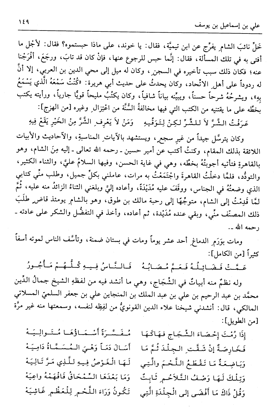 خل نَائِب الشَّام يفرج عَن ابْن تَيْمِية فَقَالَ يَا خوند على مَاذَا حبستموه فَقَالَ لأجل مَا أفتى بِهِ فِي تِلْكَ الْمَسْأَلَة فَقَالَ إِنَّمَا حبس للرُّجُوع عَنْهَا فَإِن كَانَ قد تَابَ وَرجع أفرجنا عَنهُ فَكَانَ ذَلِك سَبَب تَأْخِيره فِي السجْن وَكَانَ لَهُ ميل إِلَى مُحي الدّين بن الْعَرَبِيّ إِلَّا أَن لَهُ ردودا على أهل الِاتِّحَاد وَكَانَ يحدث على حَدِيث أبي هُرَيْرَة كنت سَمعه الَّذِي يسمع بِهِ ويشرحه شرحا حسنا ويبينه بَيَانا شافيا وَكَانَ يكْتب مليحا قَوِيا جَارِيا ورأيته يكْتب بِخَطِّهِ على مَا يقتنيه من الْكتب الَّتِي فِيهَا مُخَالفَة السّنة من اعتزال وَغَيره // (من الهزج) //