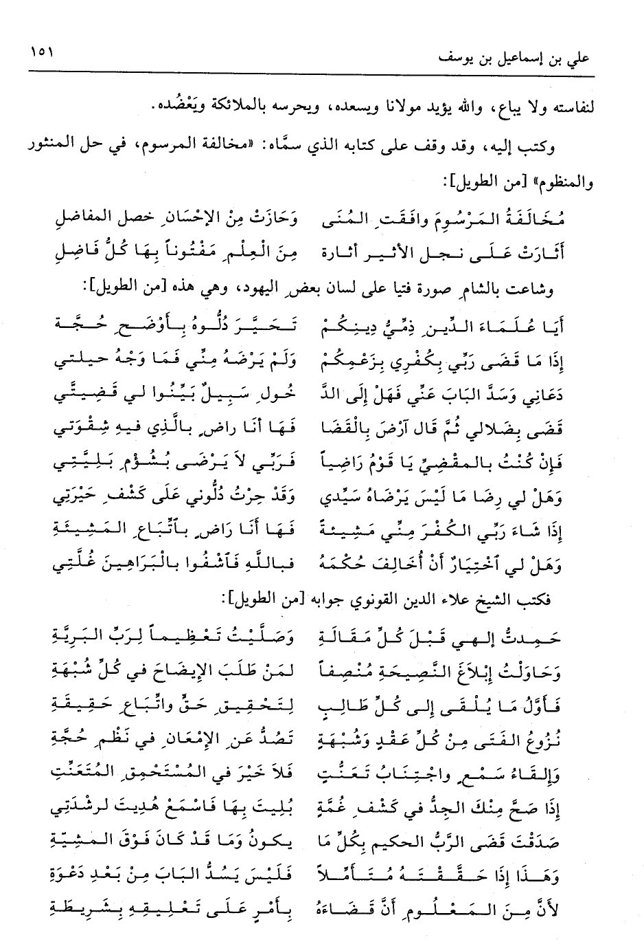 وَلَا لنفاسته وَلَا يُبَاع وَالله يُؤَيّد مَوْلَانَا ويسعده ويحرسه بِالْمَلَائِكَةِ ويعضده وَكتب إِلَيْهِ وَقد وقف على كِتَابه الَّذِي سَمَّاهُ مُخَالفَة المرسوم فِي حل المنثور والمنظوم // (من الطَّوِيل) //