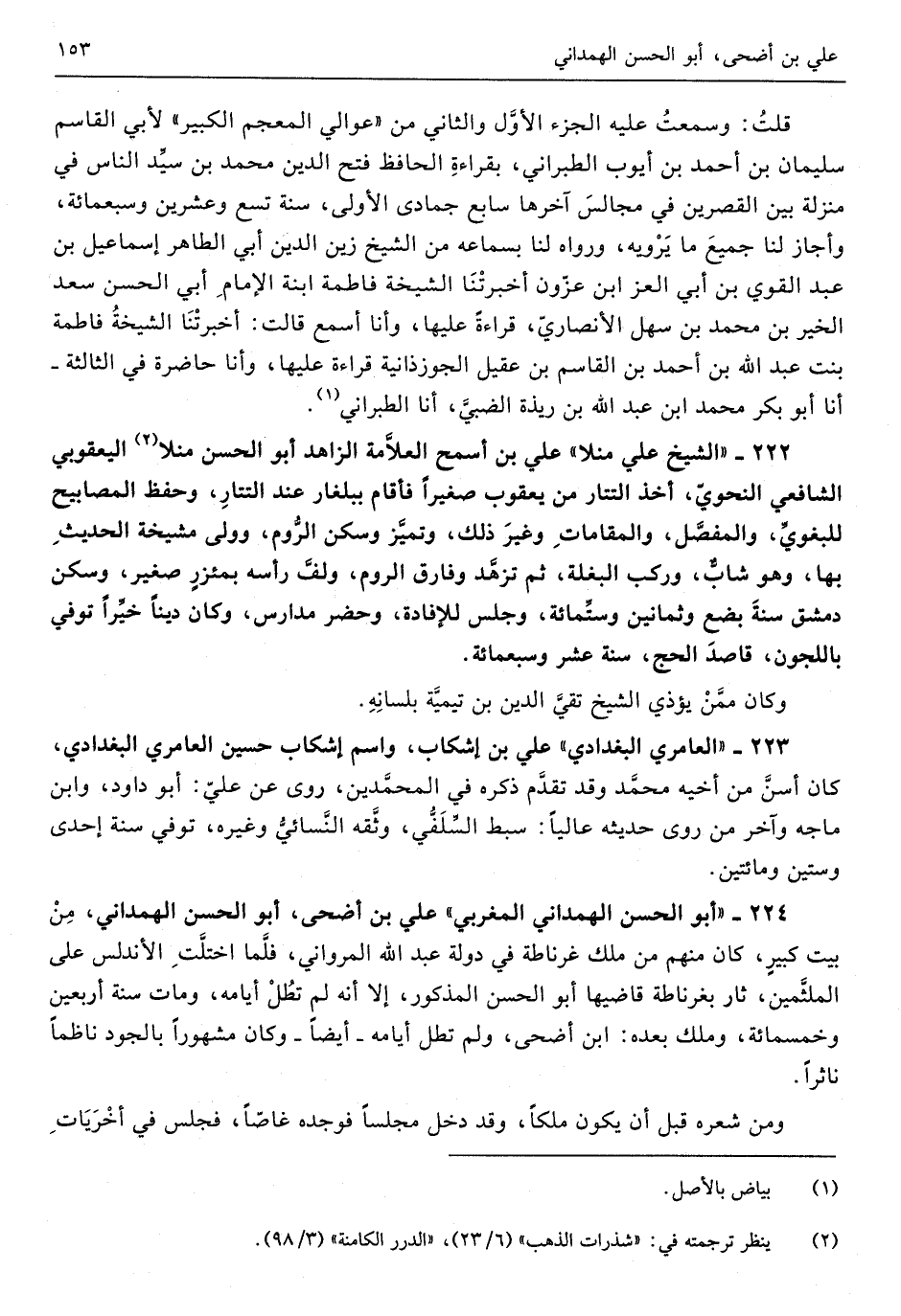 224 - أَبُو الْحسن الْهَمدَانِي المغربي عَليّ بن أضحى أَبُو الْحسن الْهَمدَانِي من بَيت كَبِير كَانَ مِنْهُم ملك غرناطة فِي دولة عبد الله المرواني فَلَمَّا اختلت الأندلس على الملثمين ثار بغرناطة قاضيها أَبُو الْحسن الْمَذْكُور إِلَّا انه لم تطل أَيَّامه وَمَات سنة أَرْبَعِينَ وَخَمْسمِائة وَملك بعده ابْن أضحى وَلم تطل أَيَّامه أَيْضا وَكَانَ مَشْهُورا بالجود ناظما ناثرا وَمن شعره قبل أَن يكون ملكا وَقد دخل مَجْلِسا فَوَجَدَهُ غاصا فَجَلَسَ فِي أخريات