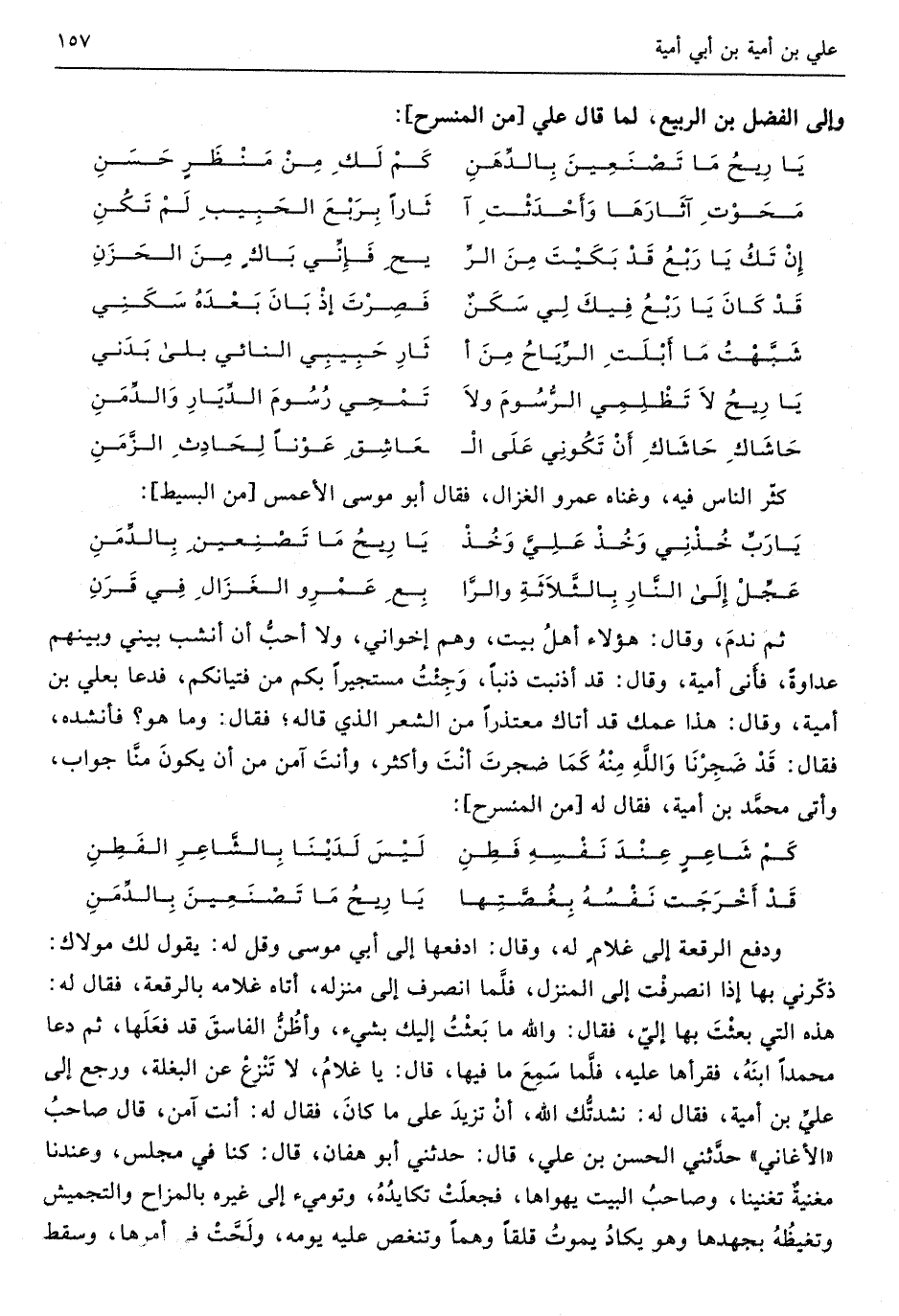 ثمَّ نَدم وَقَالَ هَؤُلَاءِ أهل بَيت وهم إخْوَانِي وَلَا أحب أَن أنشب بيني وَبينهمْ عَدَاوَة فَأنى أُميَّة وَقَالَ قد أذنبت ذَنبا وَجئْت مستجيرا بكم من فتيانكم فَدَعَا بعلي بن أُميَّة وَقَالَ هَذَا عمك قد أَتَاك معتذرا من الشّعْر الَّذِي قَالَه فَقَالَ وَمَا هُوَ فأنشده فَقَالَ قد ضجرنا وَالله مِنْهُ كَمَا ضجرت أَنْت وَأكْثر وَأَنت آمن من أَن يكون منا جَوَاب وأتى مُحَمَّد بن أُميَّة فَقَالَ لَهُ // (من المنسرح) //