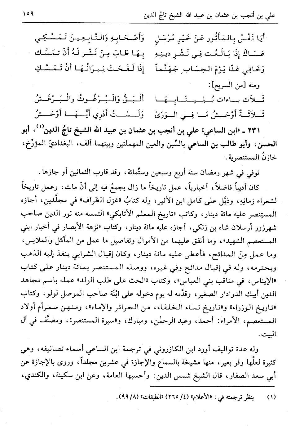 231 - ابْن السَّاعِي عَليّ بن أَنْجَب بن عُثْمَان بن عبيد الله الشَّيْخ تَاج الدّين أَبُو الْحسن أَبُو طَالب بن السَّاعِي بِالسِّين وَالْعين الْمُهْمَلَتَيْنِ وَبَينهمَا ألف الْبَغْدَادِيّ المؤرخ خَازِن المستنصرية توفّي فِي شهر رَمَضَان سنة أَربع وَسبعين وسِتمِائَة وَقد قَارب الثَّمَانِينَ أَو جازها كَانَ أديبا فَاضلا أخباريا عمل تَارِيخا مَا زَالَ يجمع فِيهِ إِلَى أَن مَاتَ وَعمل تَارِيخ لشعراء زَمَانه وذيل على كَامِل ابْن الْأَثِير وَله كتاب غزل الظراف فِي مجلدين أجَازه الْمُسْتَنْصر عَلَيْهِ مائَة دِينَار وَكَانَت تَارِيخ الْمعلم الأتابكي التمسه مِنْهُ نور الدّين صَاحب شهرزور أرسلان شاه بن زنكي أجَازه عَلَيْهِ مائَة دِينَار وَكتاب نزهة الْأَبْصَار فِي أَخْبَار ابْني المستعصم الشَّهِيد وَمَا أنْفق عَلَيْهِمَا من الْأَمْوَال وتفاصيل مَا عمل من المآكل والملابس وَمَا عمل من المدائح فَأعْطى عَلَيْهِ مائَة دِينَار وَكَانَ إقبال الشرابي ينفذ إِلَيْهِ الذَّهَب ويحترمه وَله فِي إقبال مدائح وَفِي غَيره وَوَصله الْمُسْتَنْصر بِمِائَة دِينَار على كتاب الإيناس فِي مَنَاقِب بني الْعَبَّاس وَكتاب الْحَث على طلب الْوَلَد عمله باسم مُجَاهِد الدّين أيبك الدوادار الصَّغِير وَقدمه لَهُ يَوْم دُخُوله على ابْنة صَاحب الْموصل لولو وَكتاب تَارِيخ الوزراء وتاريخ نسَاء الْخُلَفَاء من الْحَرَائِر وَالْإِمَاء ومنهن سمرأم أَوْلَاد المستعصم الْأُمَرَاء أَحْمد وَعبد الرَّحْمَن ومبارك وسيرة الْمُسْتَنْصر ومصنف فِي آل الْبَيْت وَله عدَّة تواليف أورد ابْن الكازروني فِي تَرْجَمَة ابْن السَّاعِي أَسمَاء تصانيفه وَهِي كَثِيرَة لَعَلَّهَا وقر بعير مِنْهَا مشيخة بِالسَّمَاعِ وَالْإِجَازَة فِي عشْرين مجلدا وروى بِالْإِجَازَةِ عَن أبي سعيد الصفار قَالَ الشَّيْخ شمس الدّين وأحسبها الْعَامَّة وَعَن ابْن سكينَة والكندي