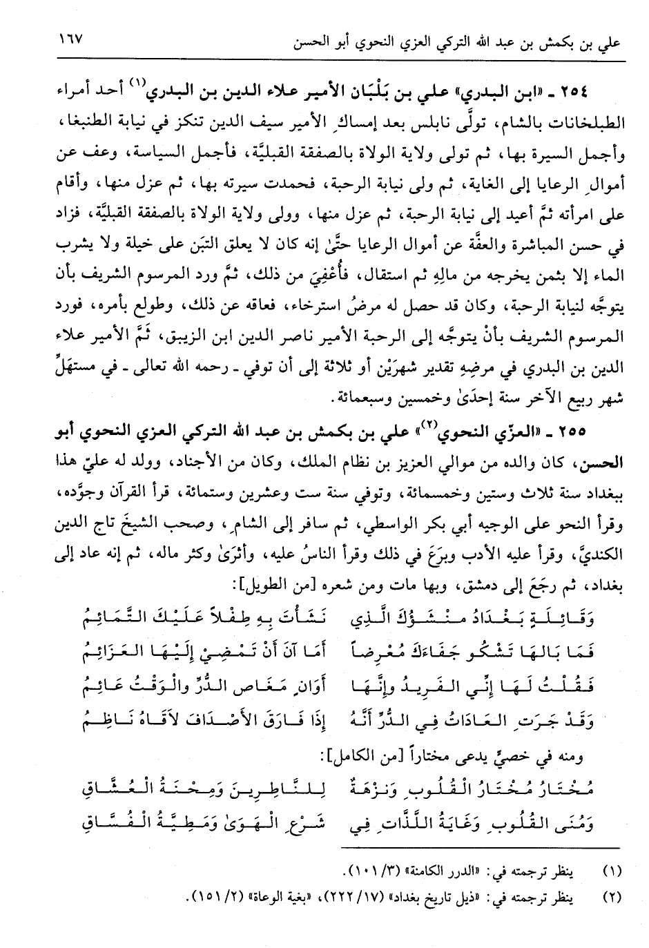 255 - الْعزي النَّحْوِيّ عَليّ بن بكمش بن عبد الله التركي الْعزي النَّحْوِيّ أَبُو الْحسن كَانَ وَالِده من موَالِي الْعَزِيز بن نظام الْملك وَكَانَ من الأجناد وَولد لَهُ عَليّ هَذَا بِبَغْدَاد سنة ثَلَاث وَسِتِّينَ وَخَمْسمِائة وَتُوفِّي سنة سِتّ وَعشْرين وسِتمِائَة قَرَأَ الْقُرْآن وجوده وَقَرَأَ النَّحْو على الْوَجِيه أبي بكر الوَاسِطِيّ ثمَّ سَافر إِلَى الشَّام وَصَحب الشَّيْخ تَاج الدّين الْكِنْدِيّ وَقَرَأَ عَلَيْهِ الْأَدَب وبرع فِي ذَلِك وَقَرَأَ النَّاس عَلَيْهِ وأثرى وَكثر مَاله ثمَّ انه عَاد إِلَى بَغْدَاد ثمَّ رَجَعَ إِلَى دمشق وَبهَا مَاتَ وَمن شعره // (من الطَّوِيل) //