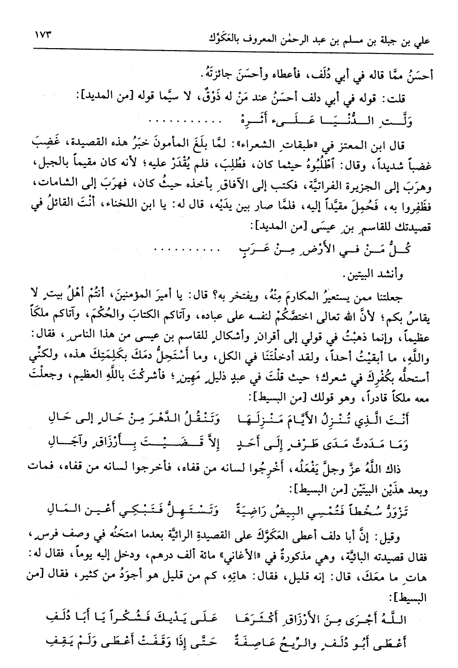 (الله أجْرى من الأرزاق أَكْثَرهَا ... على يَديك فشكرا يَا أَبَا دلف)