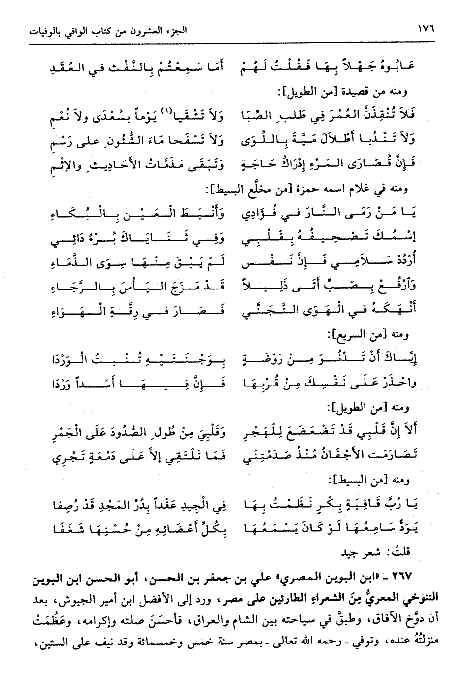267 - ابْن البوين الْمصْرِيّ عَليّ بن جَعْفَر بن الْحسن أَبُو الْحسن ابْن البوين التنوخي المعري من شعراء الطارئين على مصر ورد إِلَى الْأَفْضَل ابْن أَمِير الجيوش بعد أَن دوخ الْآفَاق وطبق فِي سياحته بَين الشَّام وَالْعراق فَأحْسن صلته وإكرامه وعظمت مَنْزِلَته عِنْده وَتُوفِّي رَحمَه الله تَعَالَى بِمصْر سنة خمس وَخَمْسمِائة وَقد نَيف على السِّتين