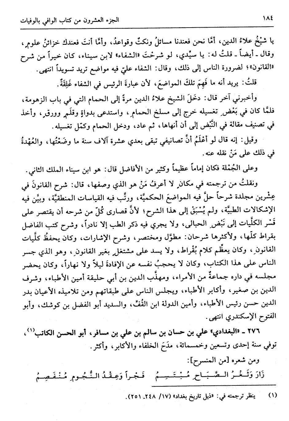 276 - الْبَغْدَادِيّ عَليّ بن حسان بن سَالم بن عَليّ بن مُسَافر أَبُو الْحسن الْكَاتِب توفّي سنة إِحْدَى وَتِسْعين وَخَمْسمِائة مدح الْخُلَفَاء والأكابر وَأكْثر وَمن شعره // (من المنسرح) //